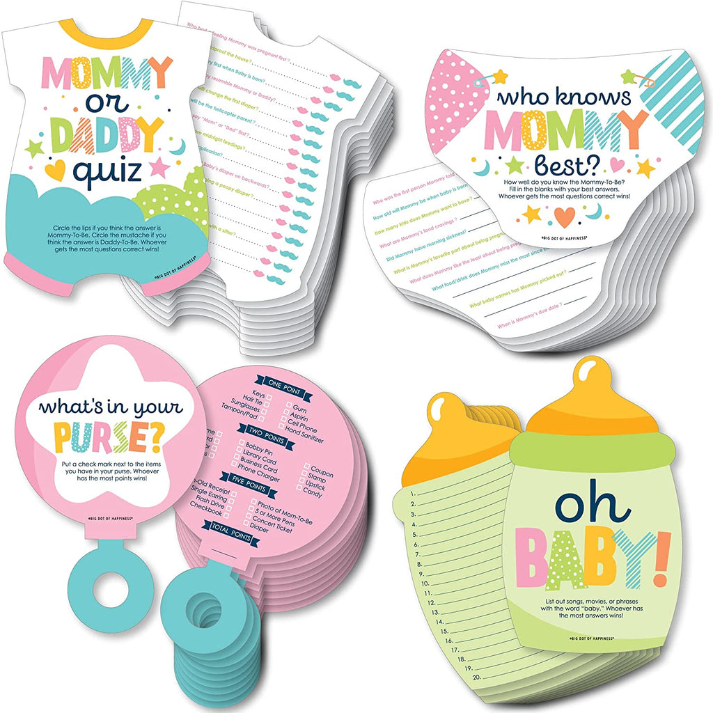 Colorful Baby Shower - 4 Baby Shower Games - 10 Cards Each - Who Knows Mommy Best, Mommy or Daddy Quiz, What’s in Your Purse and Oh Baby - Gamerific Bundle