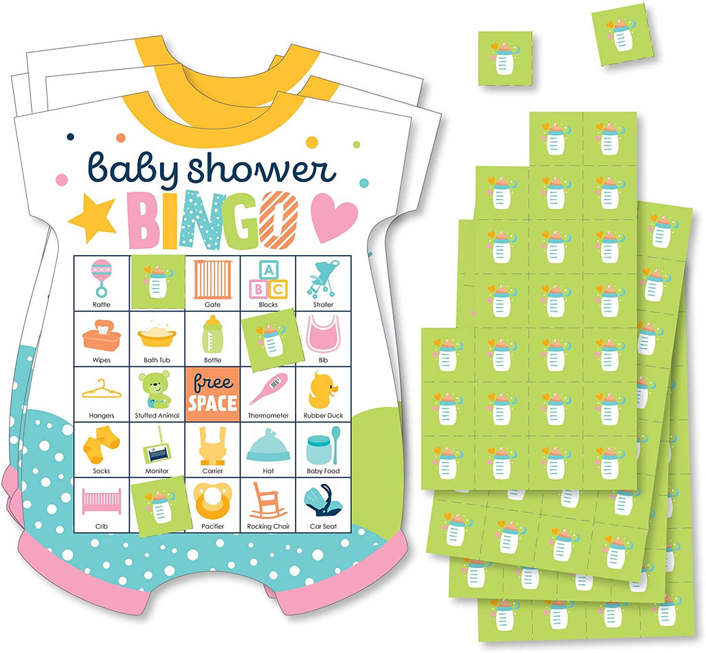 Colorful Baby Shower - Picture Bingo Cards and Markers - Baby Shower Shaped Bingo Game - Set of 18