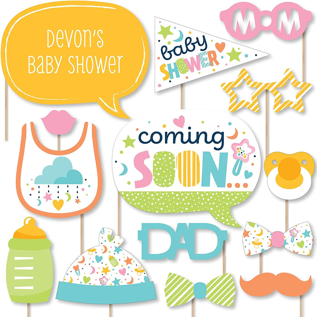 Custom Colorful Baby Shower - Photo Booth Props - Personalized Gender Neutral Party Supplies - 20 Selfie Props