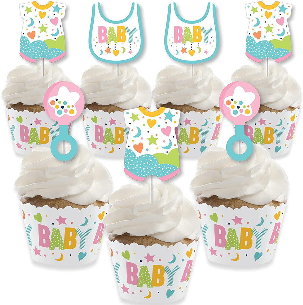 Colorful Baby Shower - Cupcake Decoration - Gender Neutral Party Cupcake Wrappers and Treat Picks Kit - Set of 24