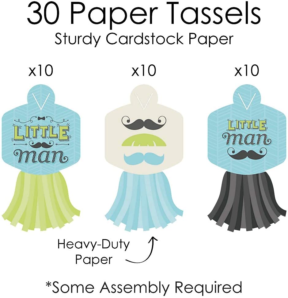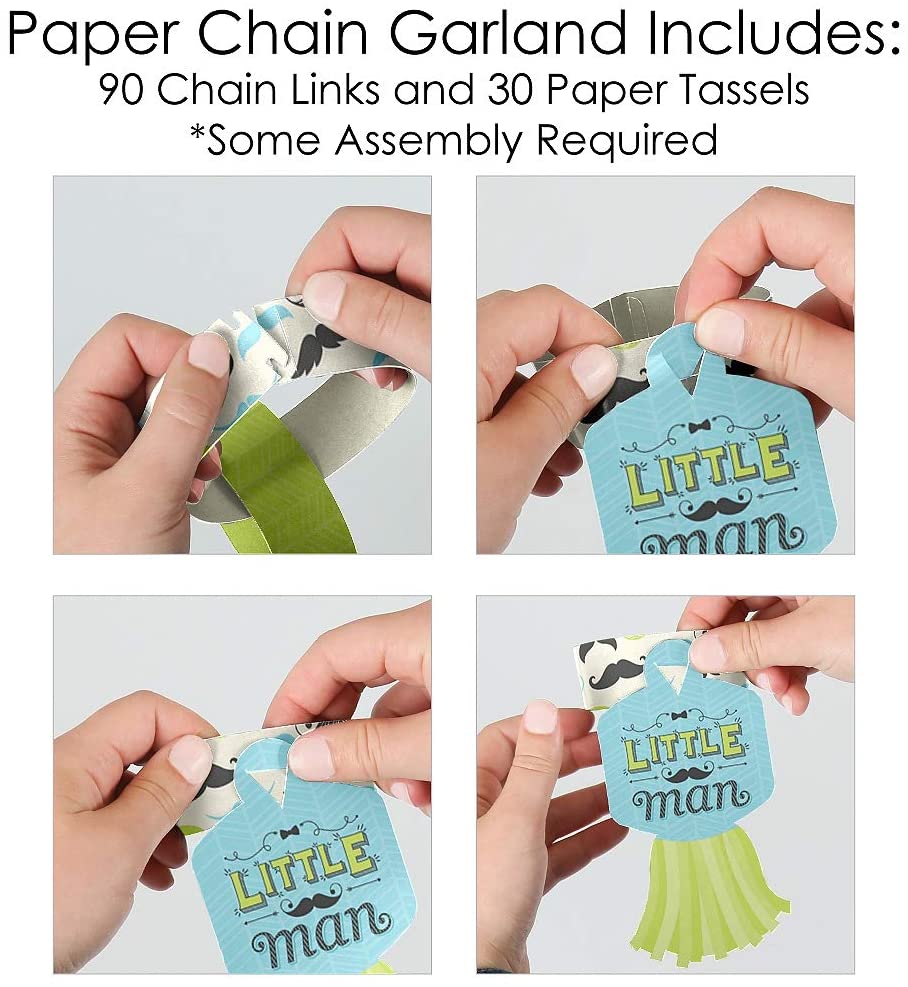 • SIMPLE ASSEMBLY: Dashing Little Man Mustache Party paper chain decoration kit will arrive flat and is easy enough for the whole family to assemble. First, form a chain link into a circle and insert the tab through the slit. Slide the next chain link through the first link and repeat until all chain links are connected, forming a paper chains garland. Attach paper tassels by inserting paper tassel through center slit located on the chain link.