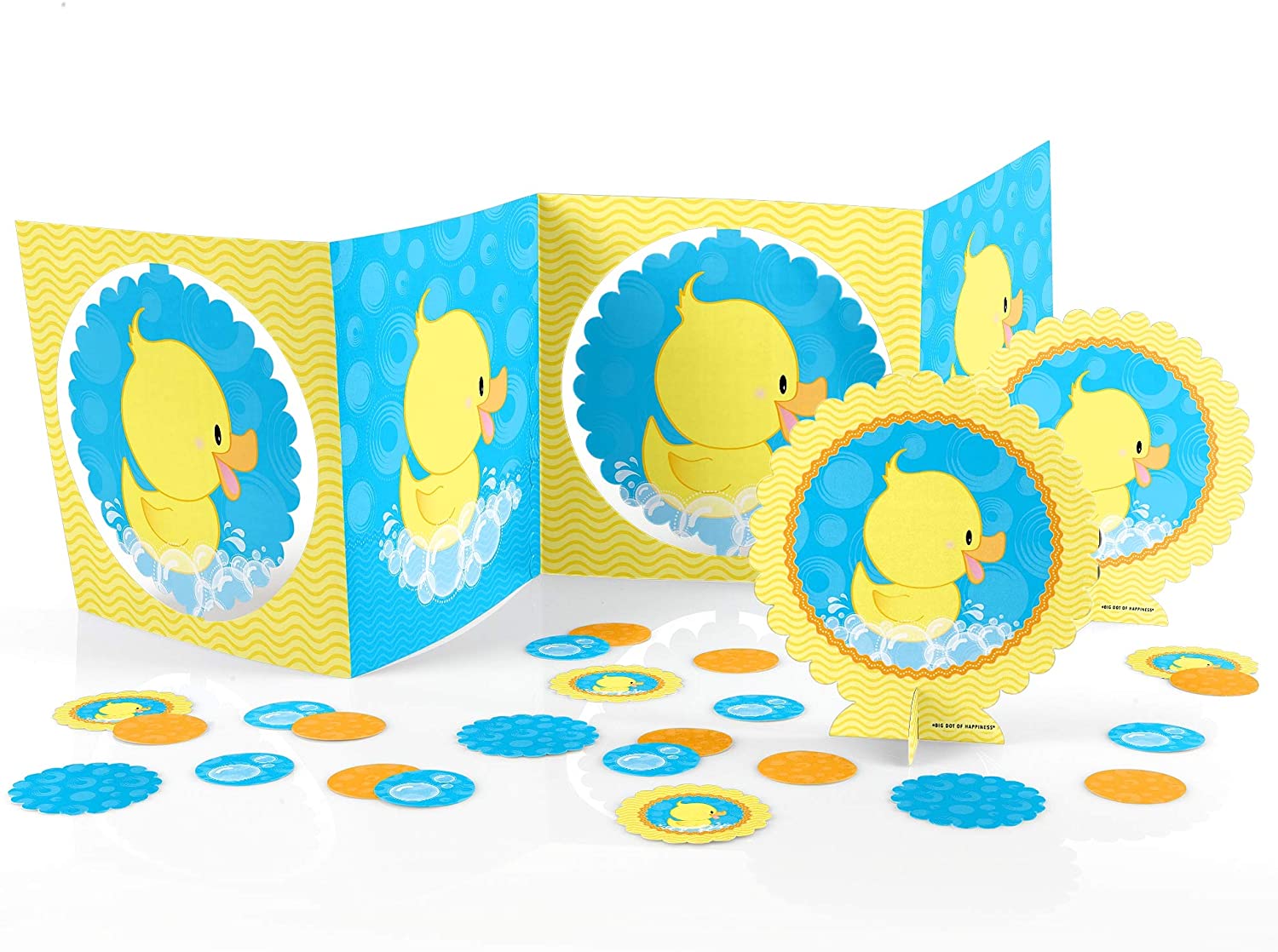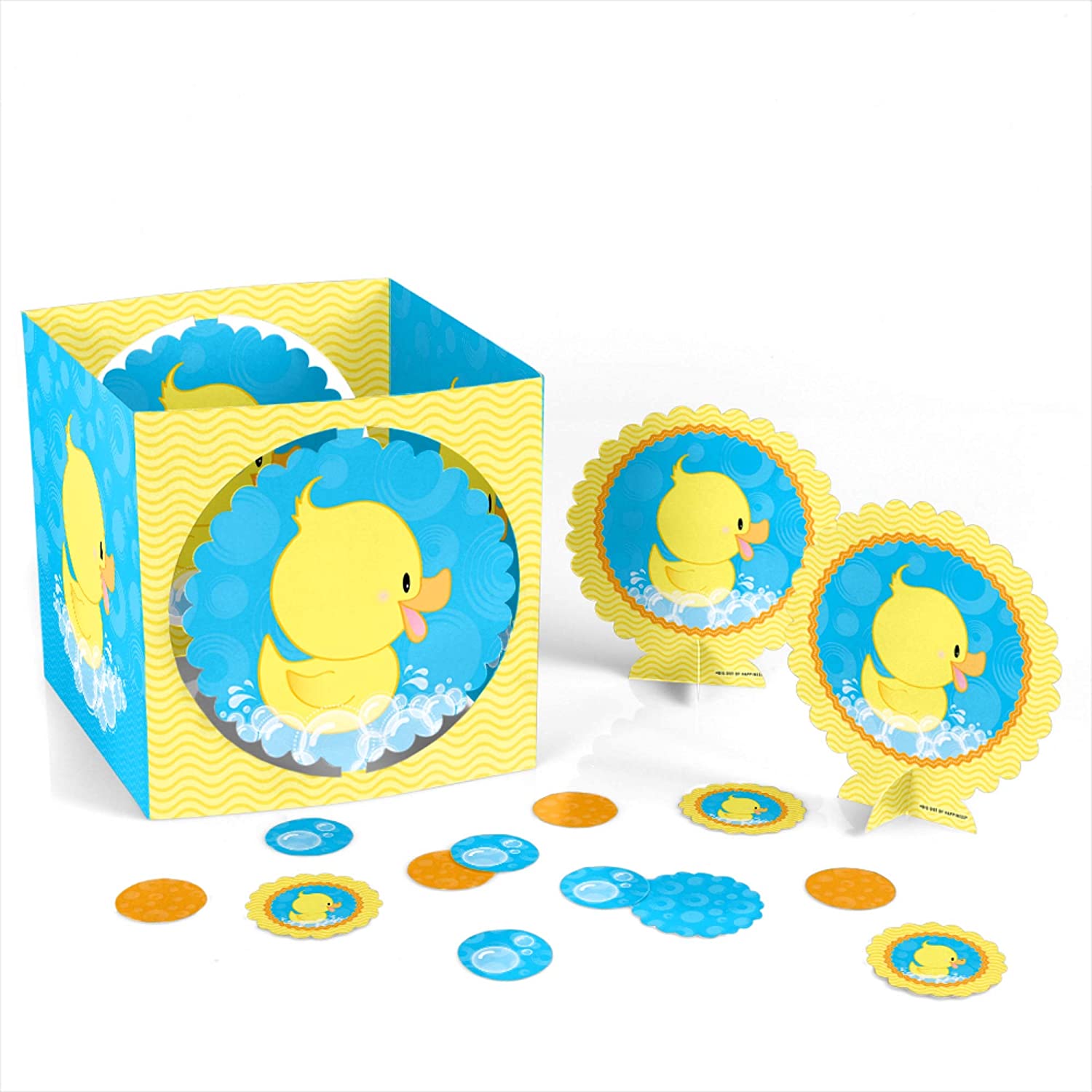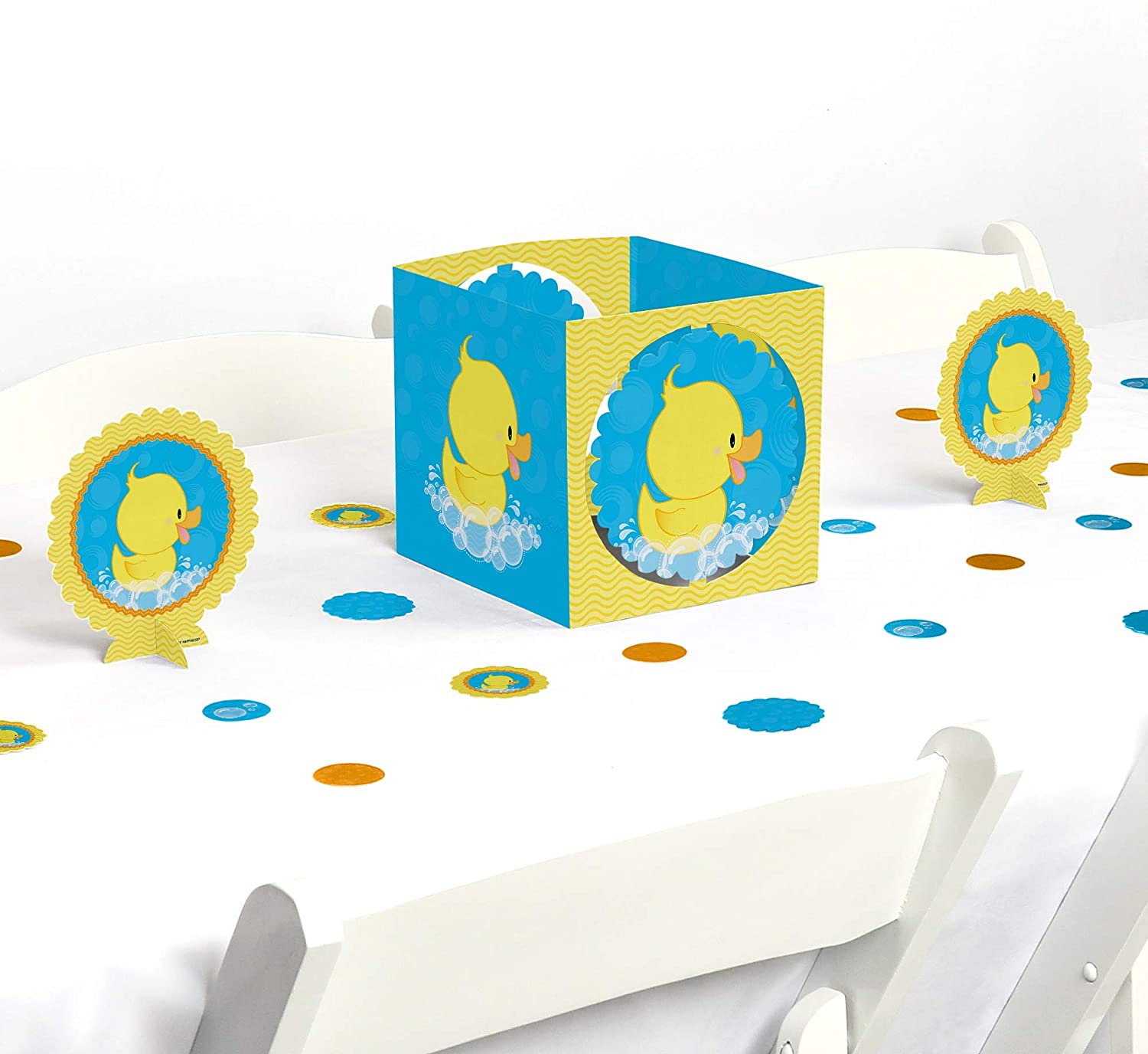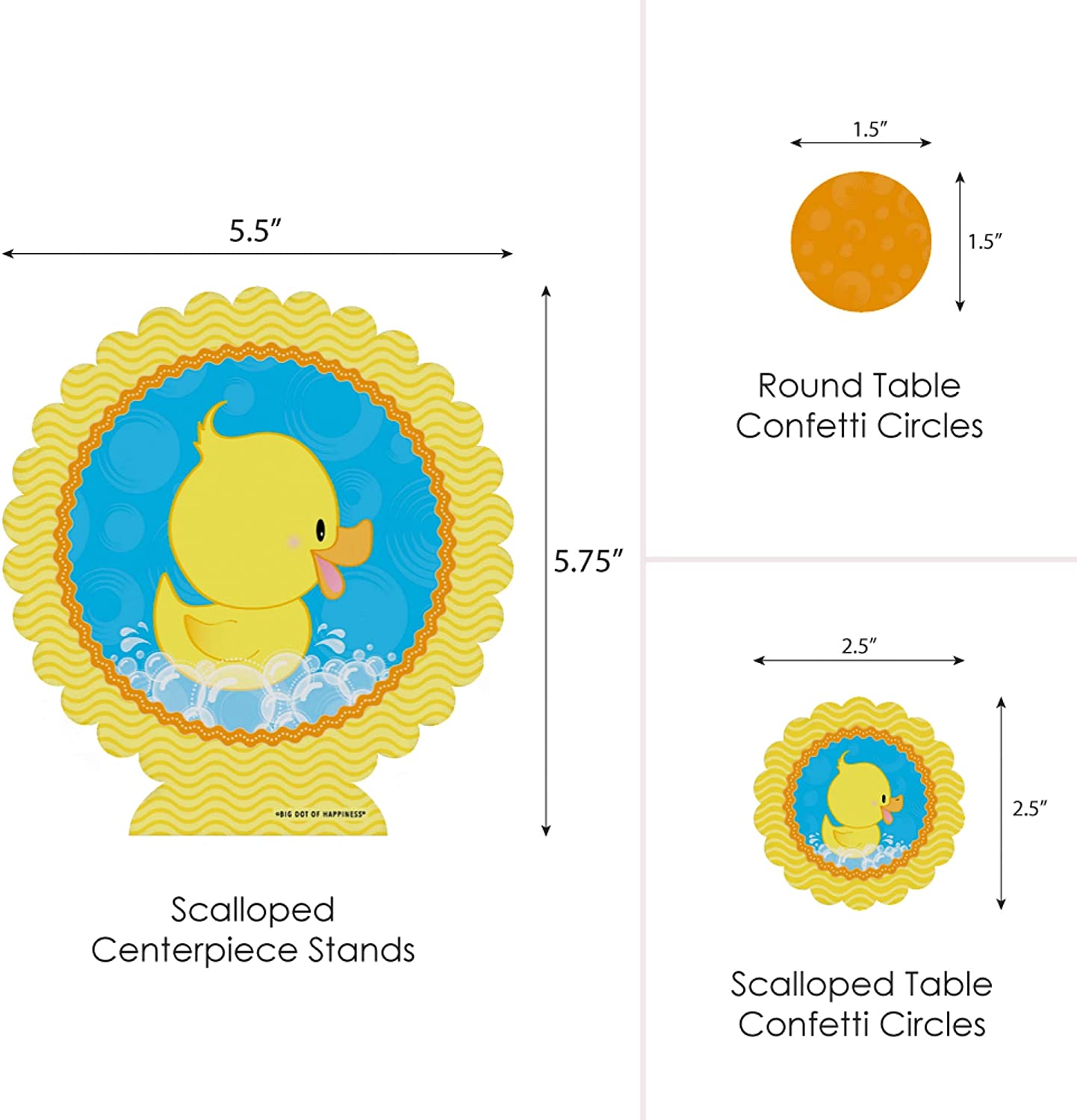 • Ducky Duck Table Decoration Kit INCLUDES 1 large centerpiece, 2 scalloped centerpieces, 12 scalloped table confetti pieces and 24 round table confetti pieces. Ducky Duck party table decorations are perfect for a baby shower or birthday party.
