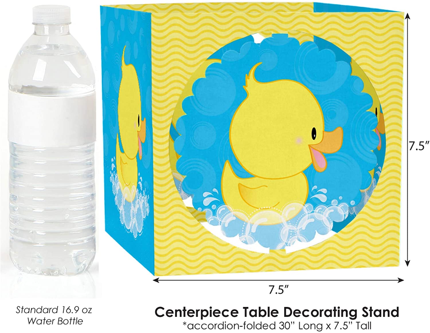• Ducky Duck party decoration kit SIZE 1 Accordion-Folded Centerpiece (may also be formed into a cube using the included stickers), 30" long x 7.5" tall; 2 Scalloped Centerpiece Stands, 5.5" wide x 5.75" tall; 12 Scalloped Table Confetti Circles, 2.5" diameter; and 24 Round Table Confetti Circles, 1.5" diameter. The unique design and variety of pieces makes this baby duck party decoration kit an impressive addition to any baby shower or birthday party.