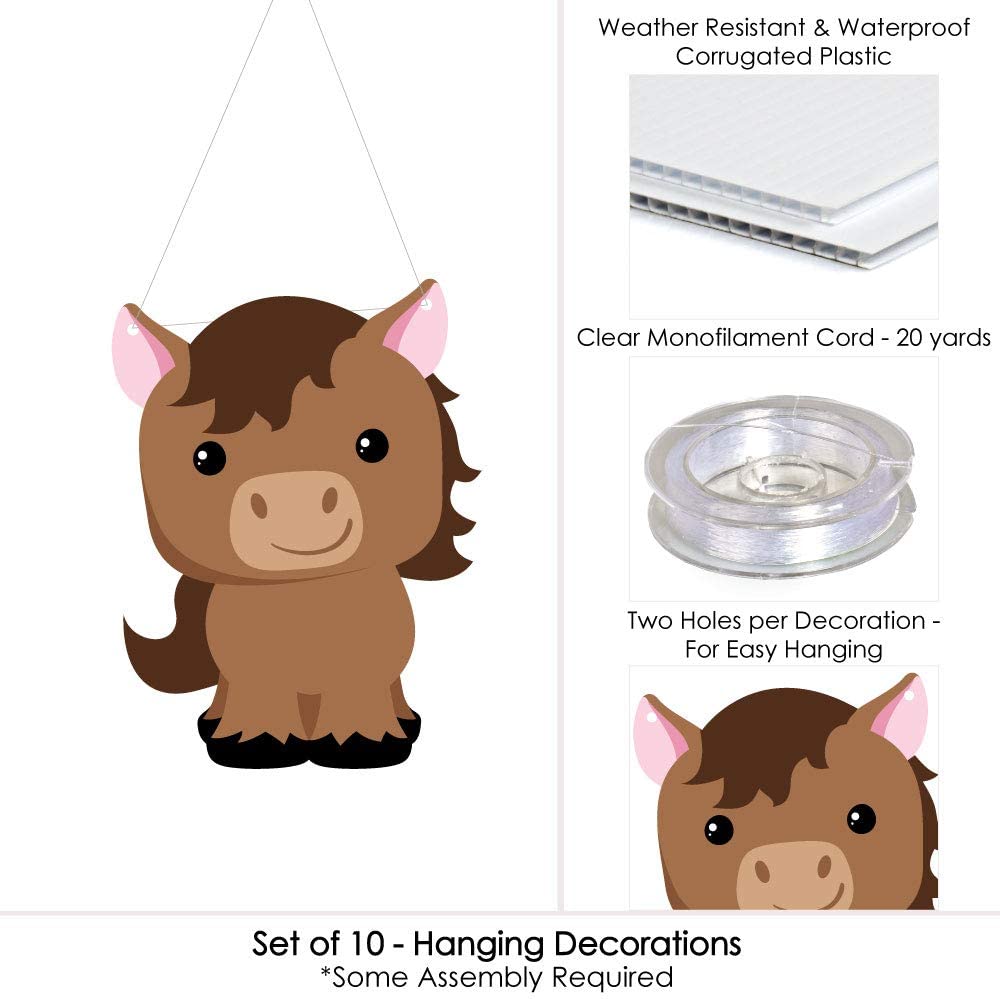 • 10-Piece Farm Animals - Barnyard hanging porch & tree yard decorations INCLUDES 10 farm animal decorations and 20 yards of monofilament cording – perfect for festive outdoor decor. This outdoor hanging decor are printed on both sides, so they will look amazing anywhere you choose to display them.