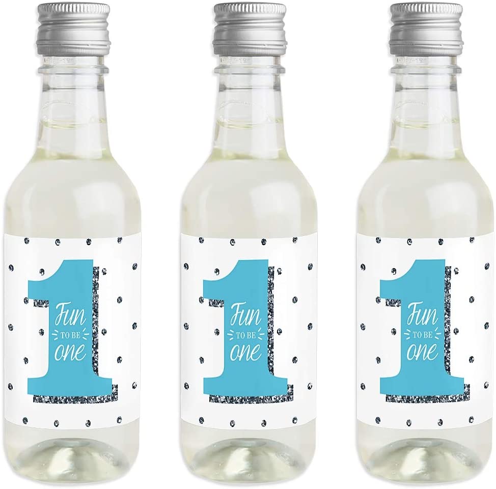 1st Birthday Boy - Fun to be One - Mini Wine and Champagne Bottle Label Stickers - First Birthday Party Favor Gift for Women and Men - Set of 16