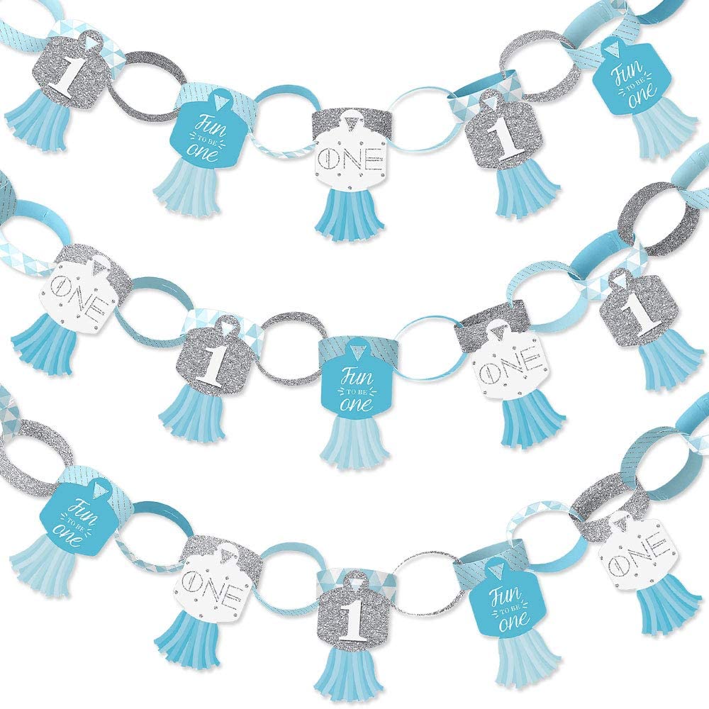 1st Birthday Boy - Fun to be One - 90 Chain Links and 30 Paper Tassels Decoration Kit - First Birthday Party Paper Chains Garland - 21 feet