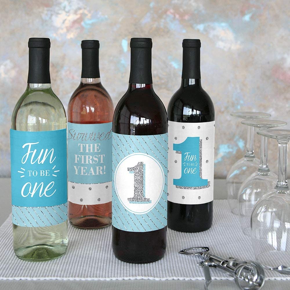 1st Birthday Boy - Fun to be One - First Birthday Party Decorations for Women and Men - Wine Bottle Label Stickers - Set of 4