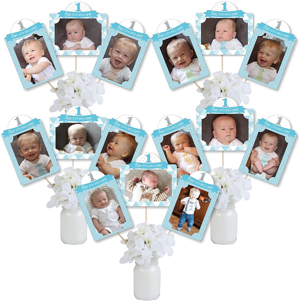 1st Birthday Boy - Fun to be One - First Birthday Party Picture Centerpiece Sticks - Photo Table Toppers - 15 Pieces