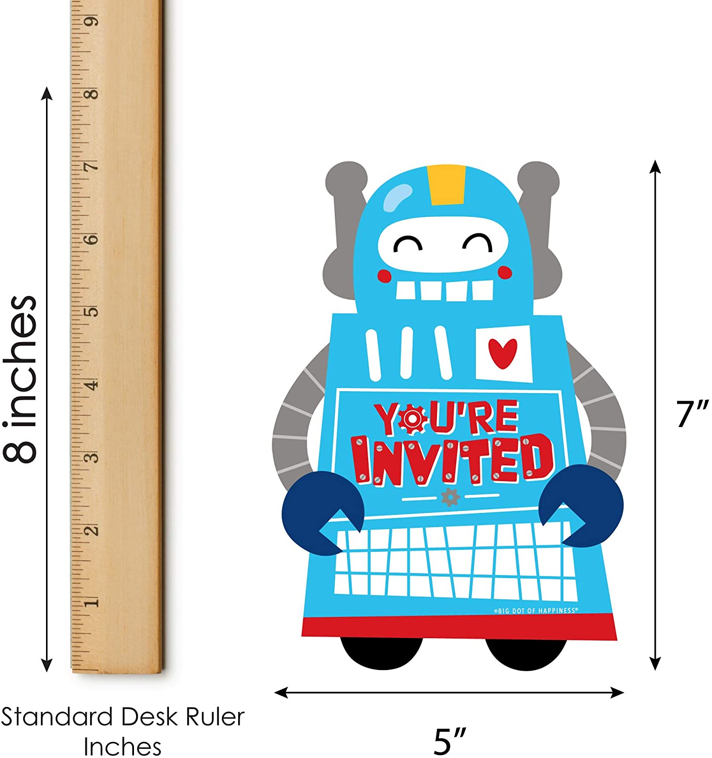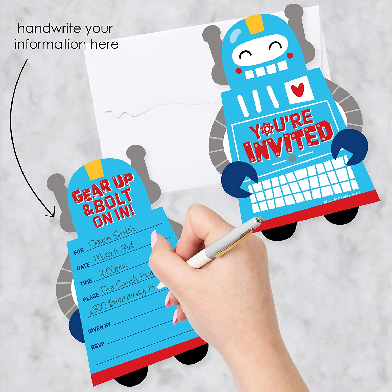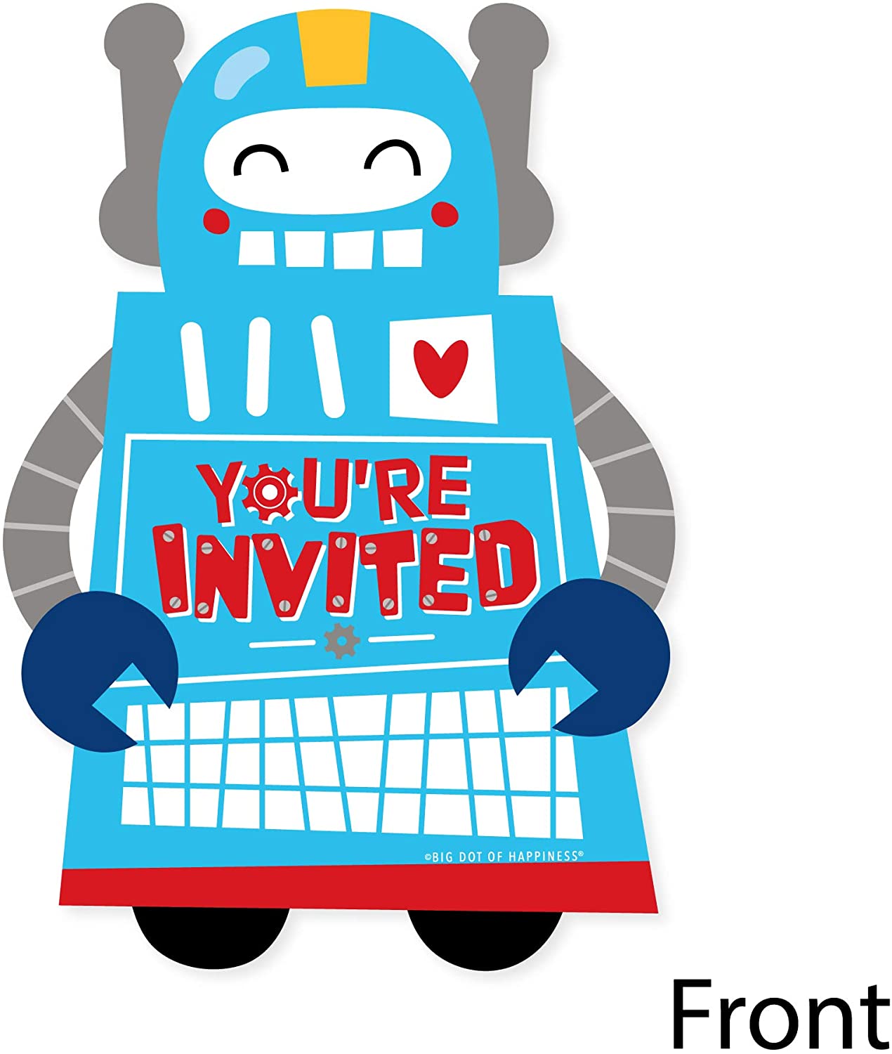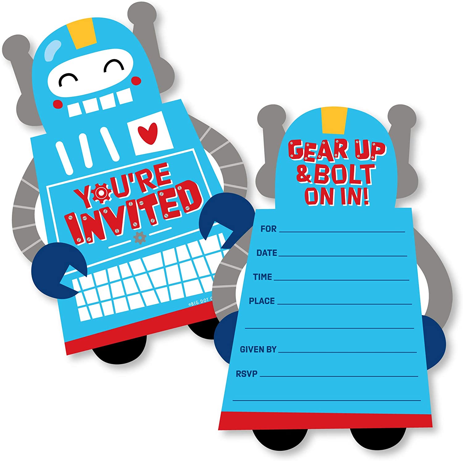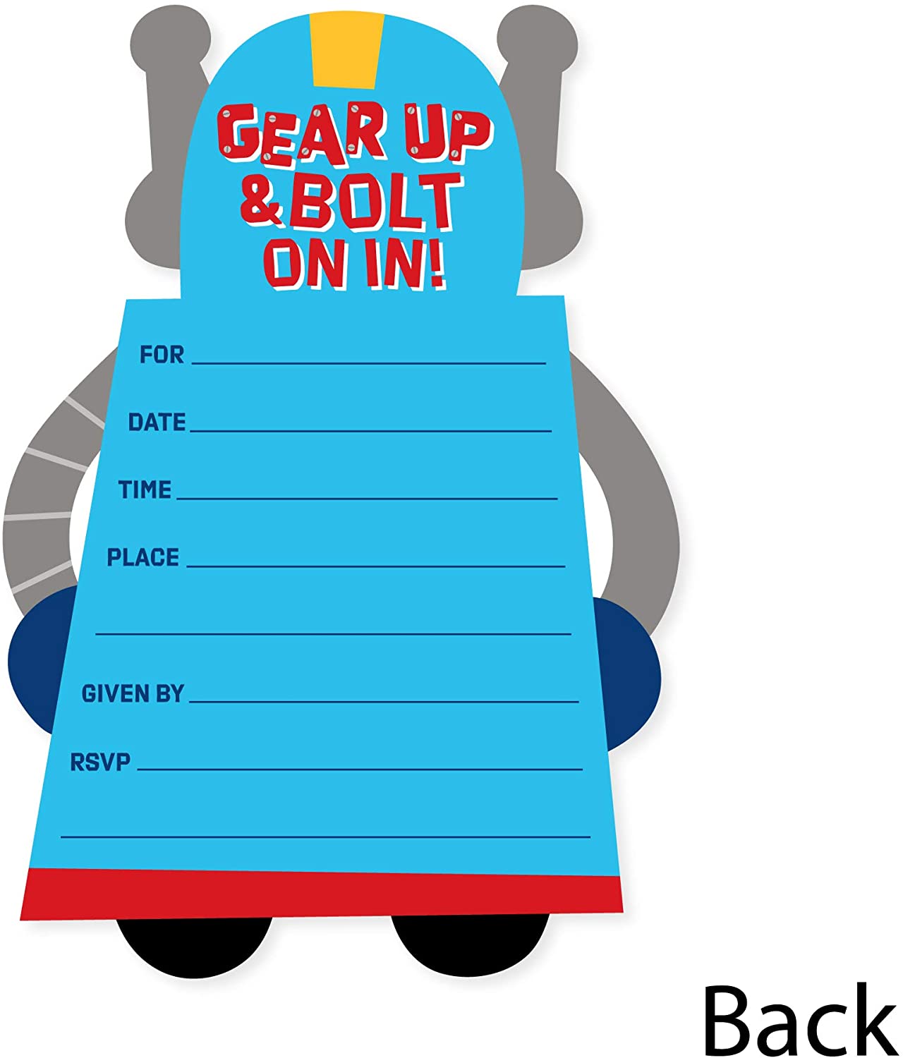 Gear Up Robots - Shaped Fill-In Invitations - Birthday Party or Baby Shower Invitation Cards with Envelopes - Set of 12 is backordered and will ship as soon as it is back in stock.