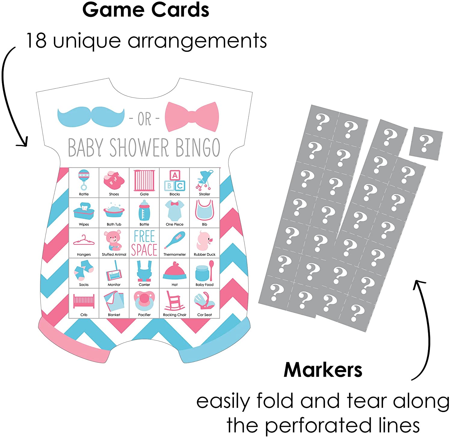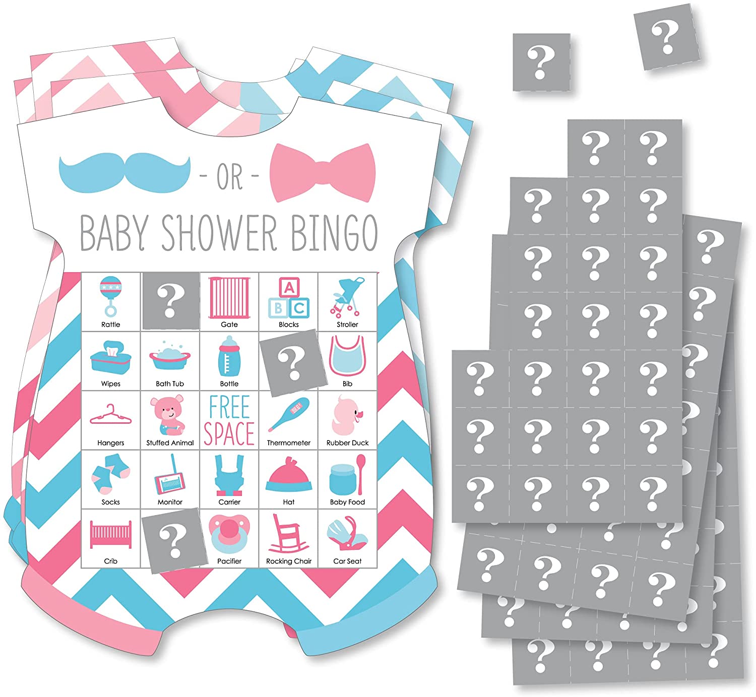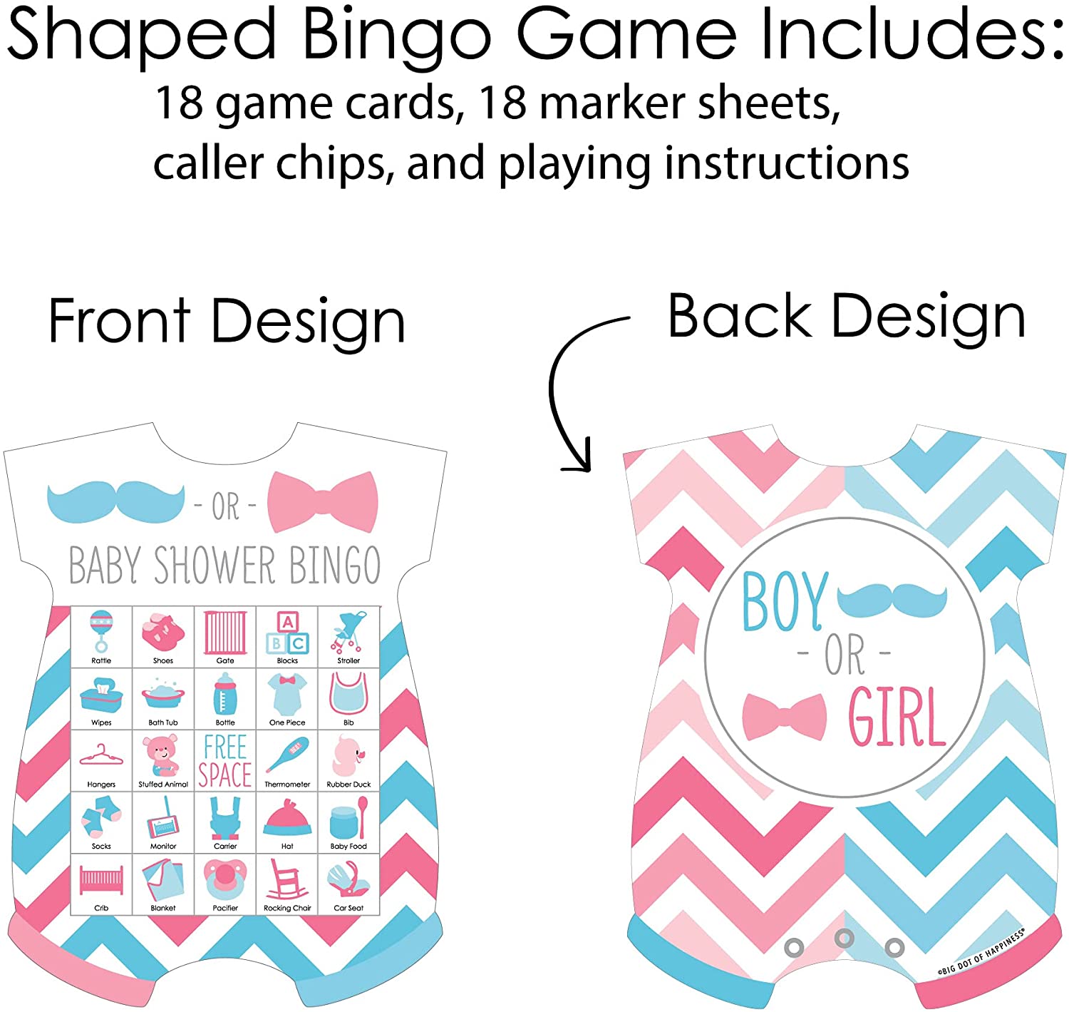 Chevron Gender Reveal - Picture Bingo Cards and Markers - Gender Reveal Party Baby Shower Shaped Bingo Game - Set of 18 is backordered and will ship as soon as it is back in stock.