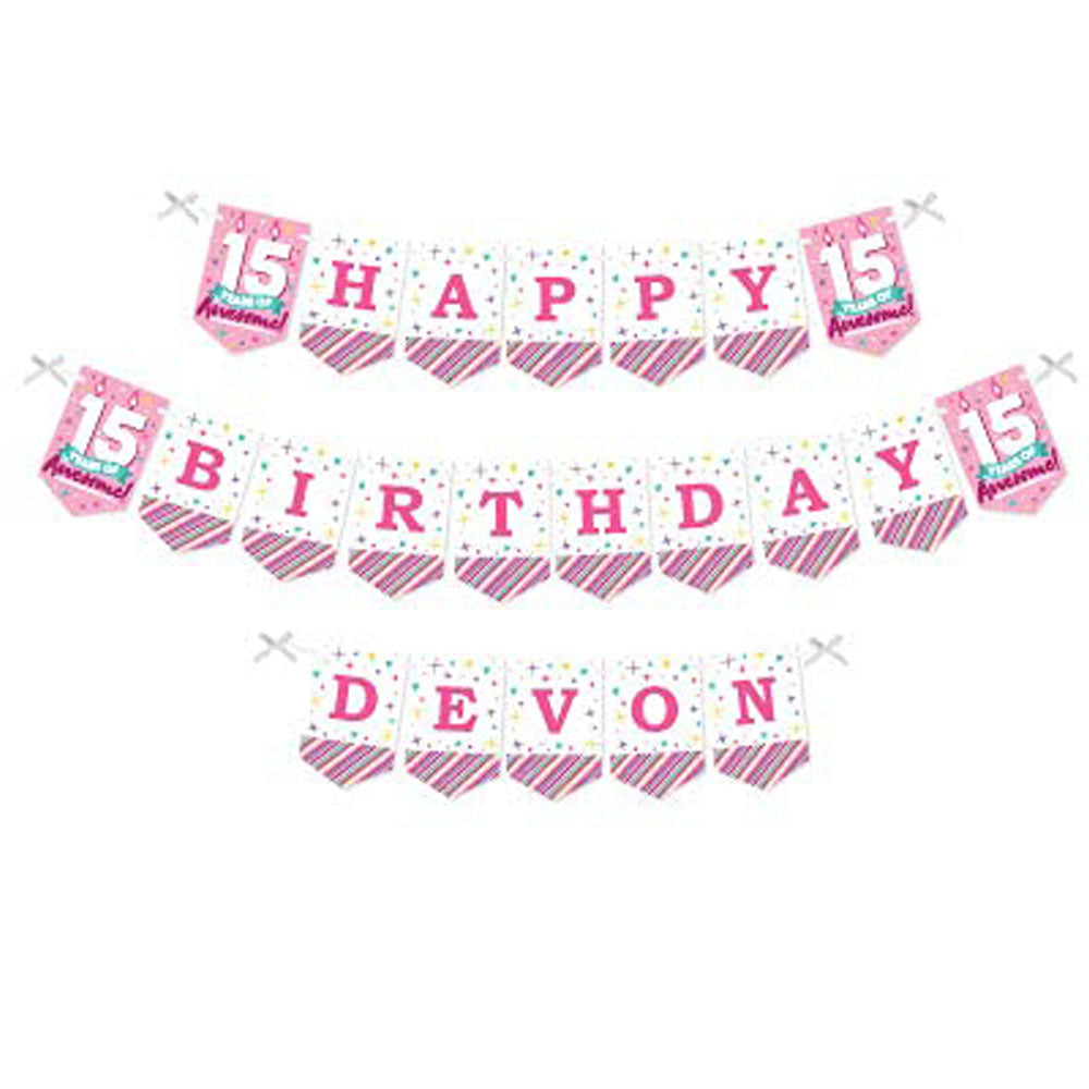 Personalized Girl 15th Birthday - Custom Teen Birthday Party Bunting Banner and Decorations - Happy Birthday Custom Name Banner