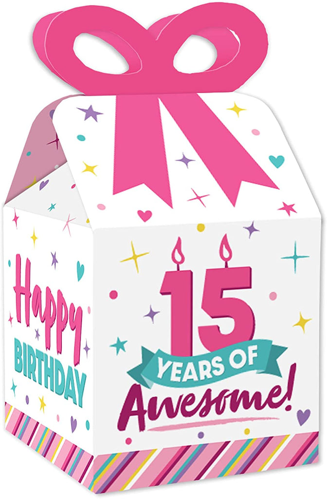 Girl 15th Birthday - Square Favor Gift Boxes - Teen Birthday Party Bow Boxes - Set of 12