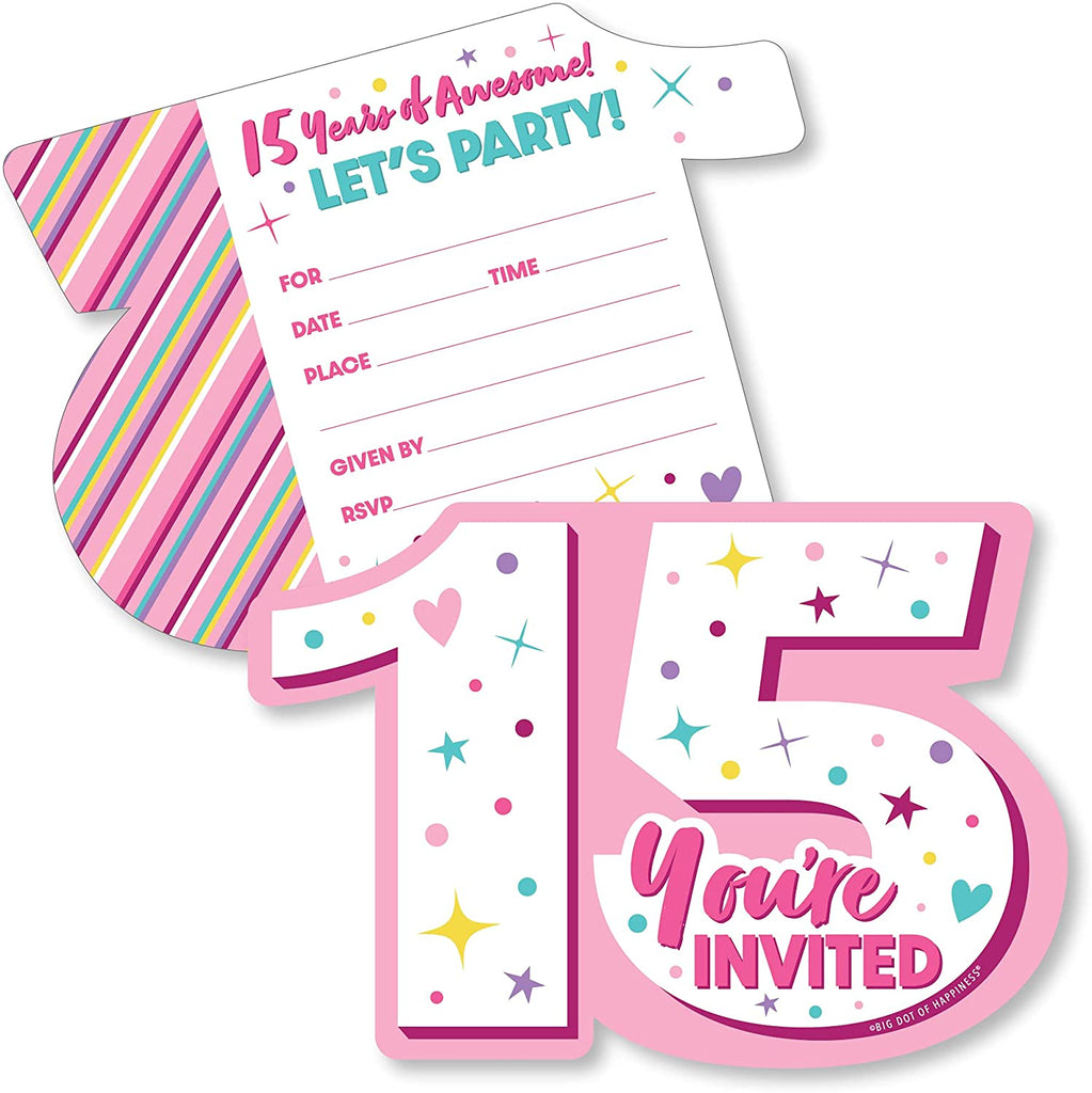 Girl 15th Birthday - Shaped Fill-In Invitations - Teen Birthday Party Invitation Cards with Envelopes - Set of 12