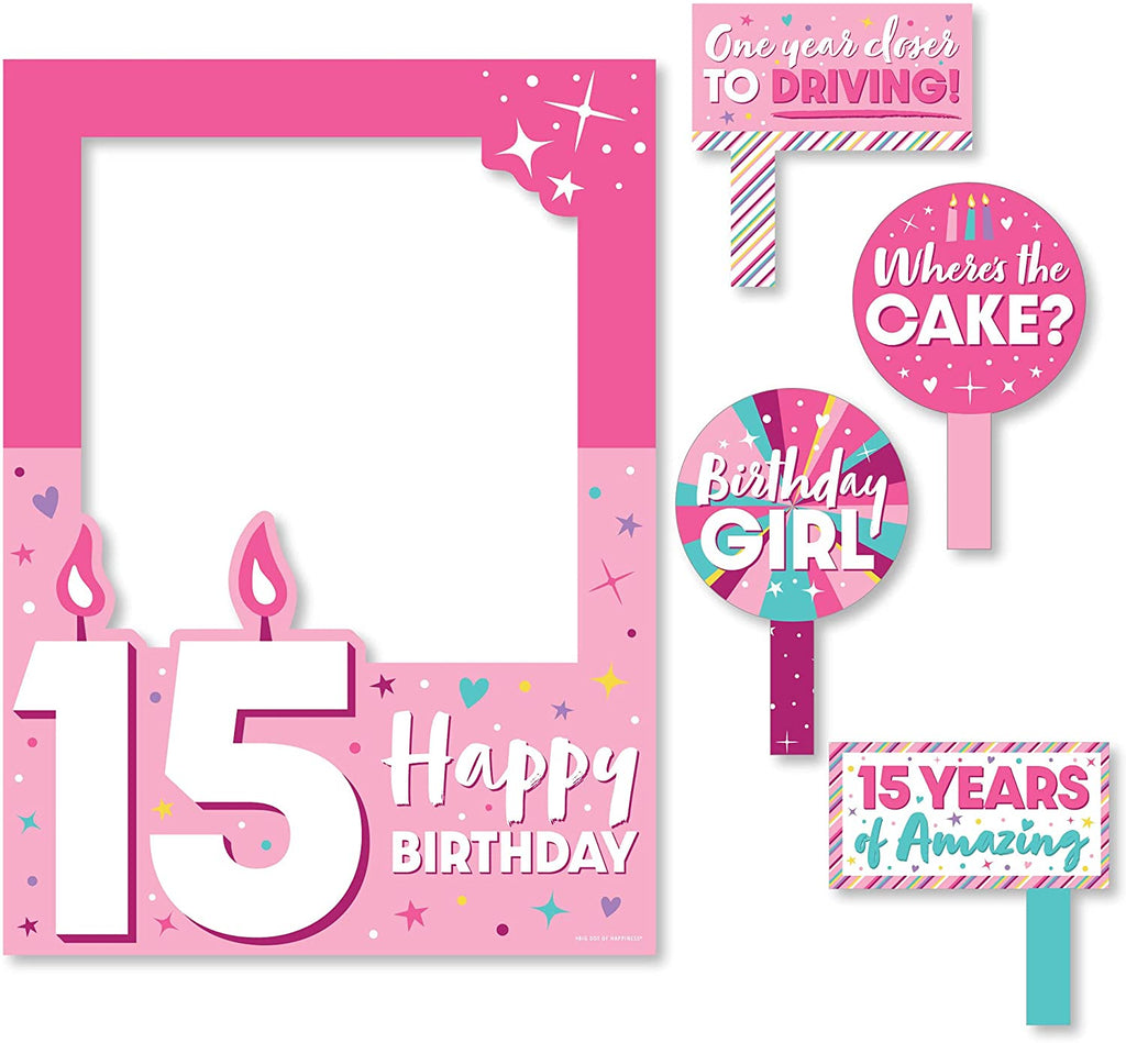 Girl 15th Birthday - Teen Birthday Party Selfie Photo Booth Picture Frame and Props