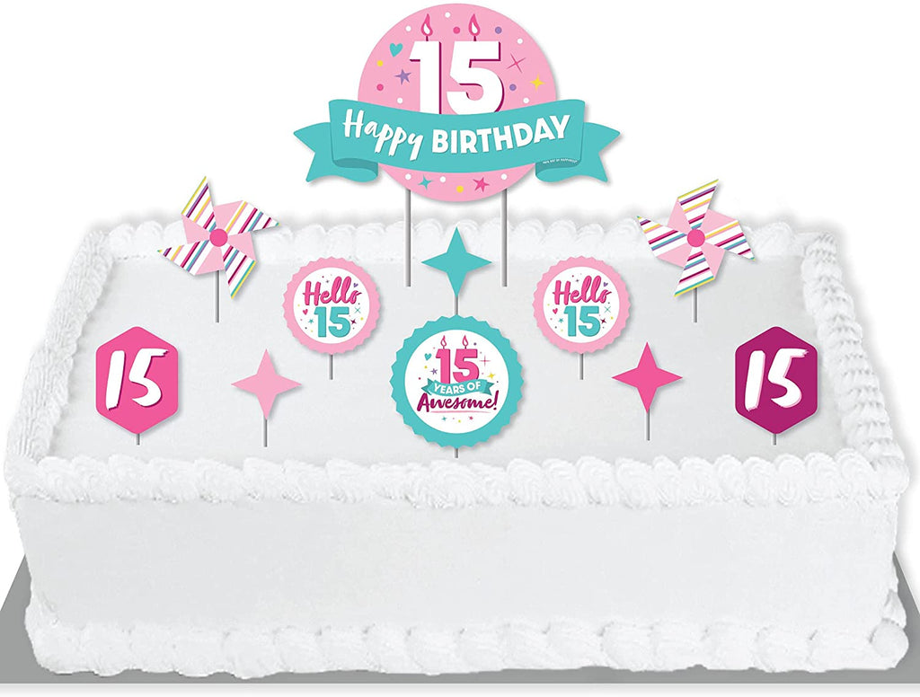 Girl 15th Birthday - Teen Birthday Party Cake Decorating Kit - Happy Birthday Cake Topper Set - 11 Pieces