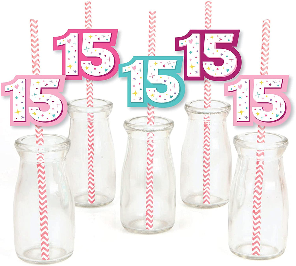 Girl 15th Birthday - Paper Straw Decor - Teen Birthday Party Striped Decorative Straws - Set of 24