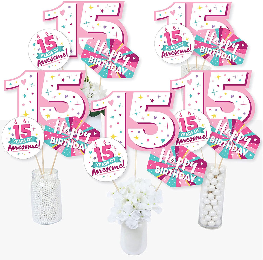 Girl 15th Birthday - Teen Birthday Party Centerpiece Sticks - Table Toppers - Set of 15