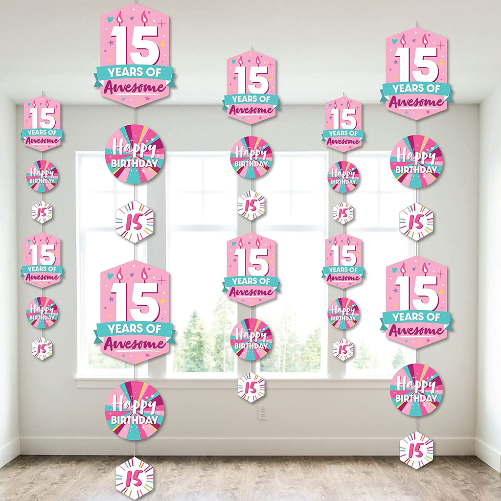 Girl 15th Birthday - Teen Birthday Party DIY Dangler Backdrop - Hanging Vertical Decorations - 30 Pieces