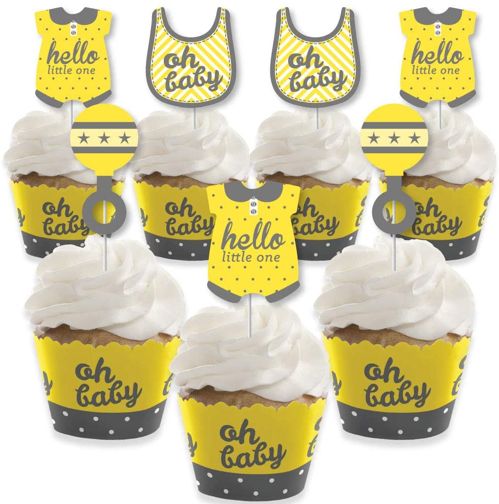 Hello Little One - Yellow and Gray - Cupcake Decoration - Neutral Baby Shower Cupcake Wrappers and Treat Picks Kit - Set of 24