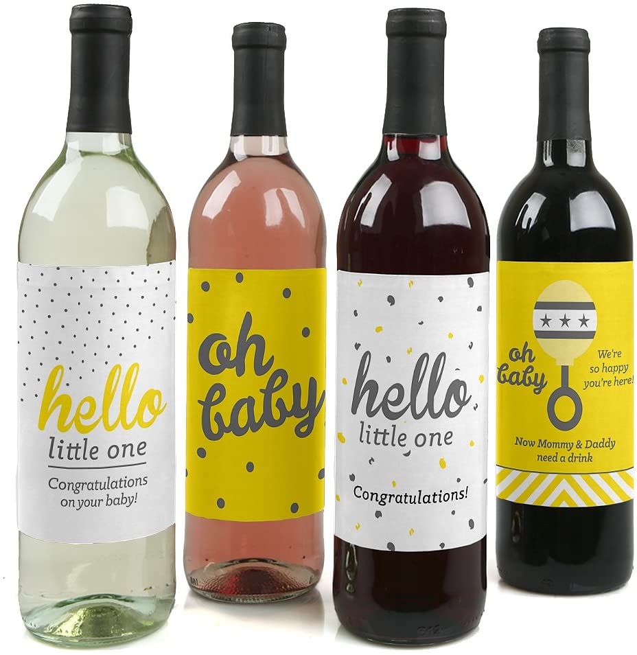 Hello Little One – Yellow and Gray Wine Bottle Label Stickers – Set of 4