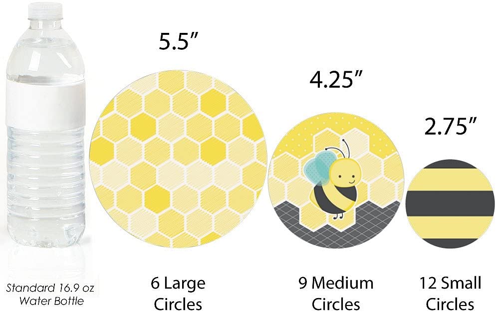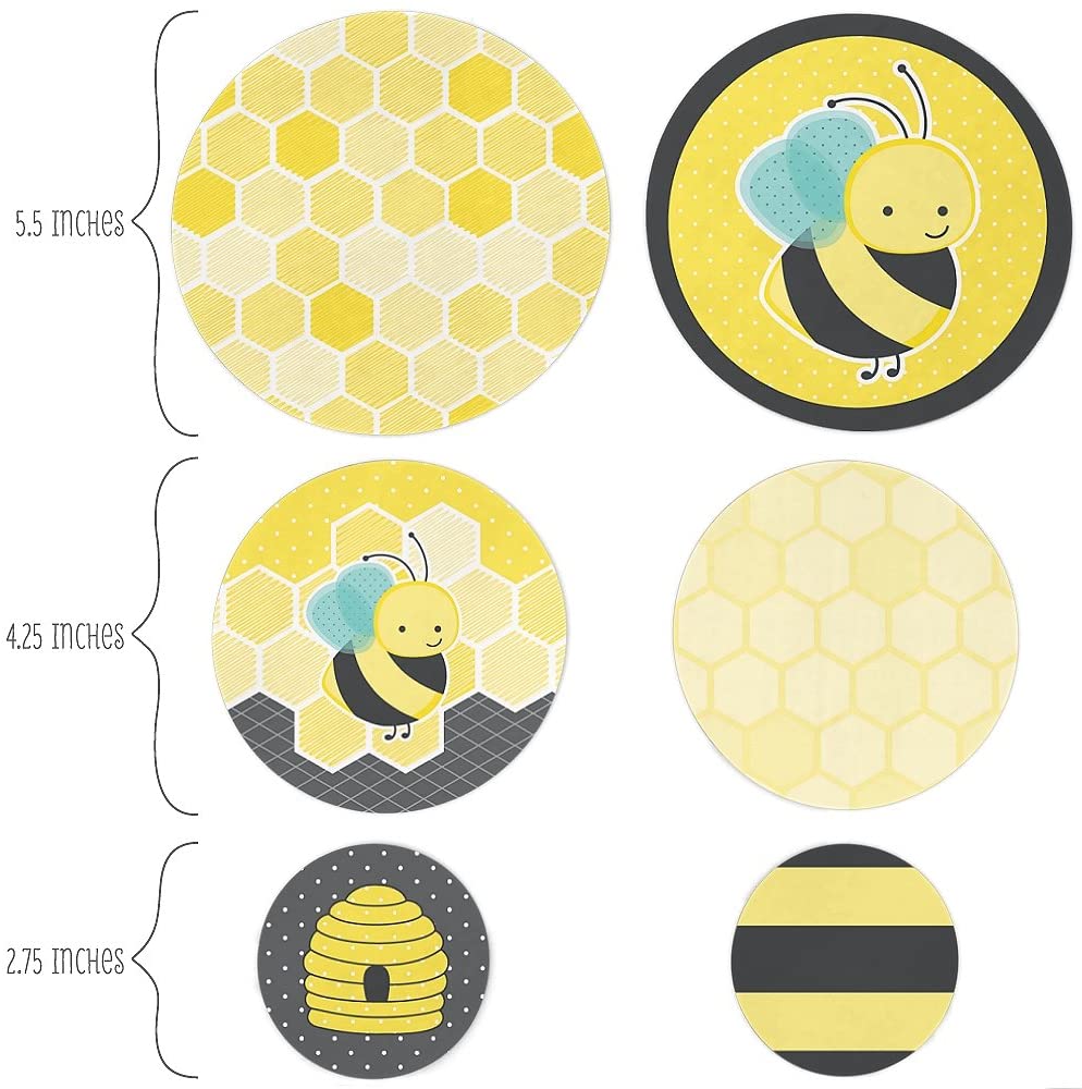 • Honey Bee giant circle confetti SIZE 5.5 inches large circles, six qty; 4.25 inches medium circles, nine qty; and 2.75 inches small circles, twelve qty. The unique design and large size makes these bee hive party decorations an impressive addition to any baby shower or birthday party.