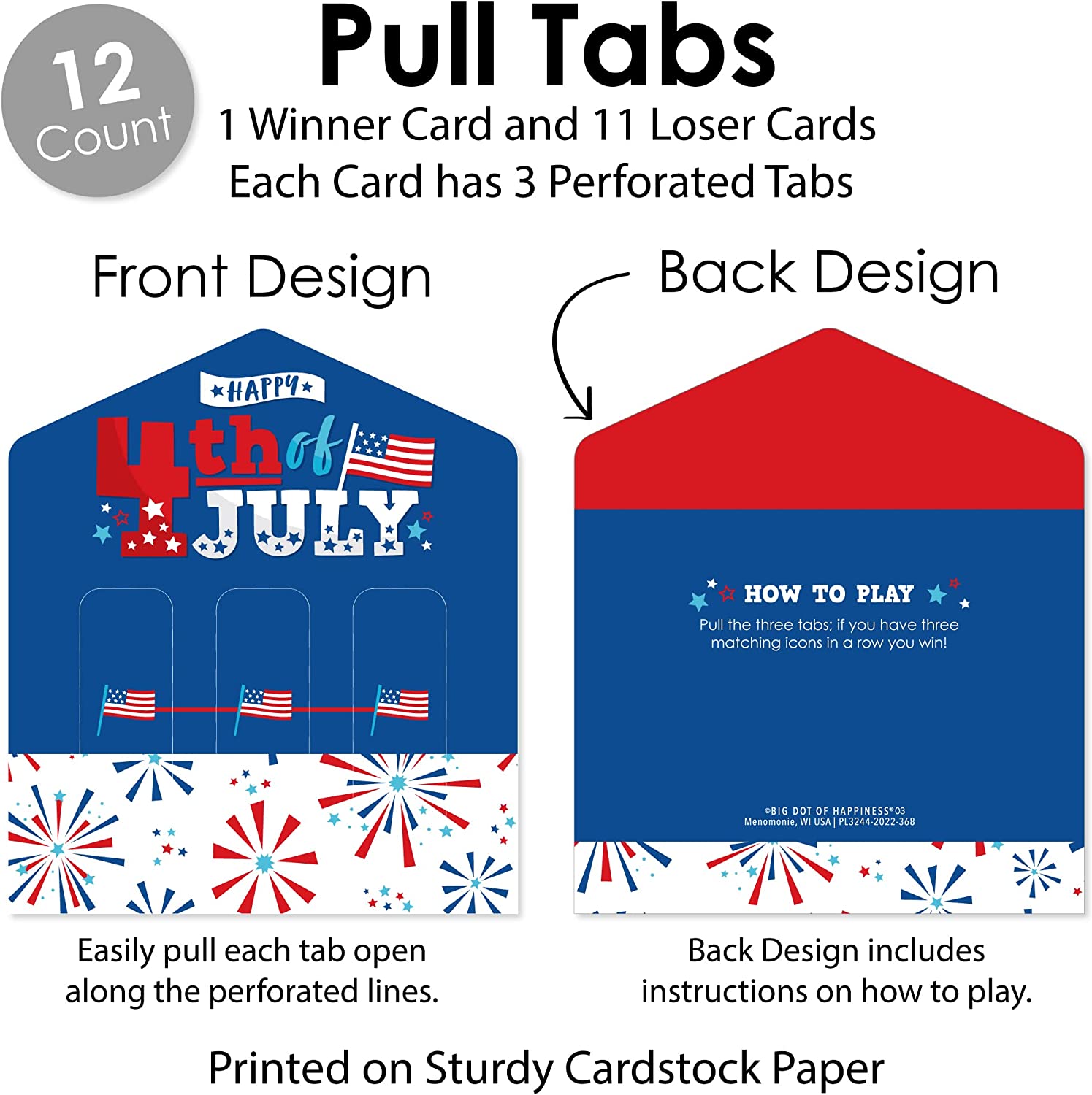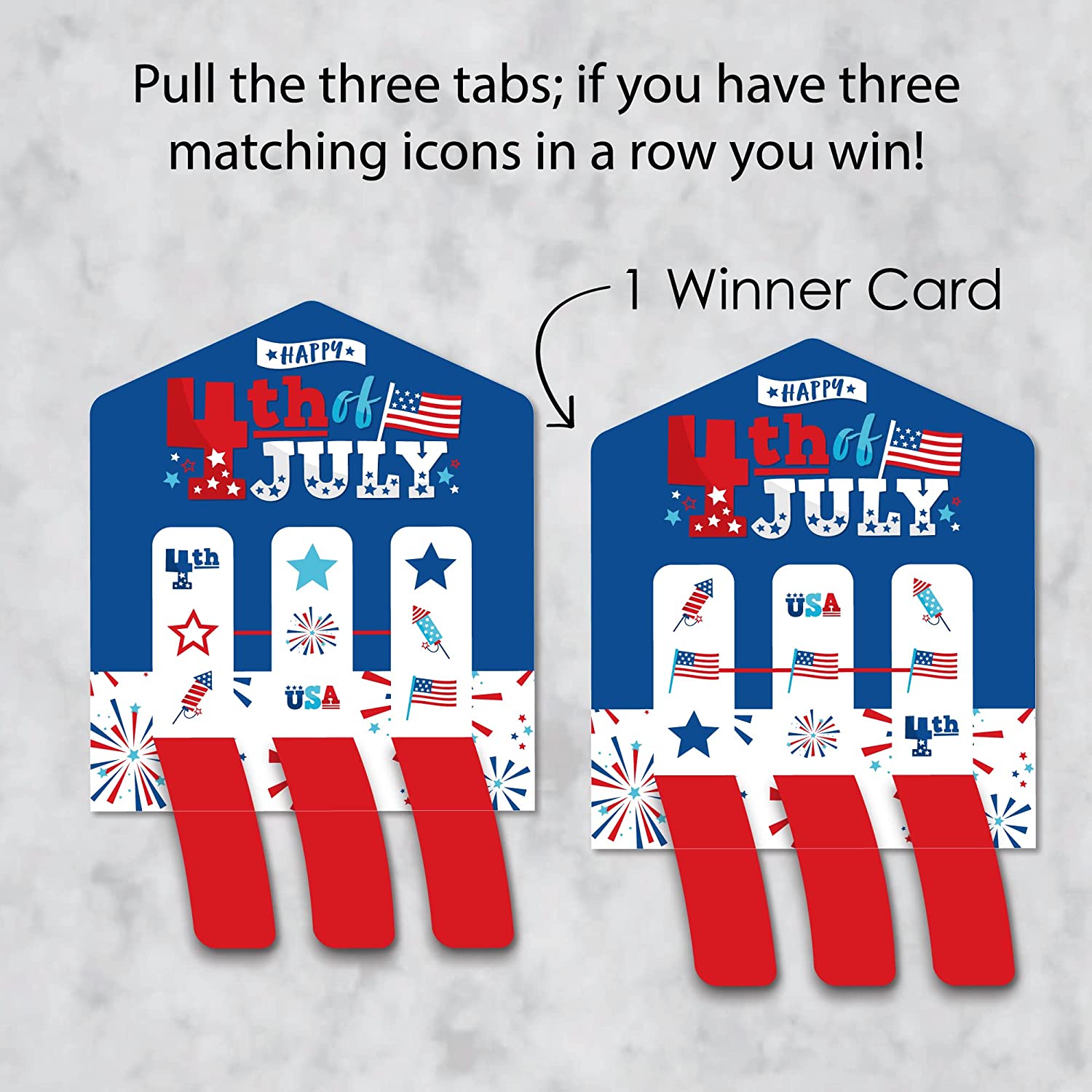 Firecracker 4th of July - Red, White and Royal Blue Party Game Pickle Cards - Pull Tabs 3-in-a-Row - Set of 12 is backordered and will ship as soon as it is back in stock.