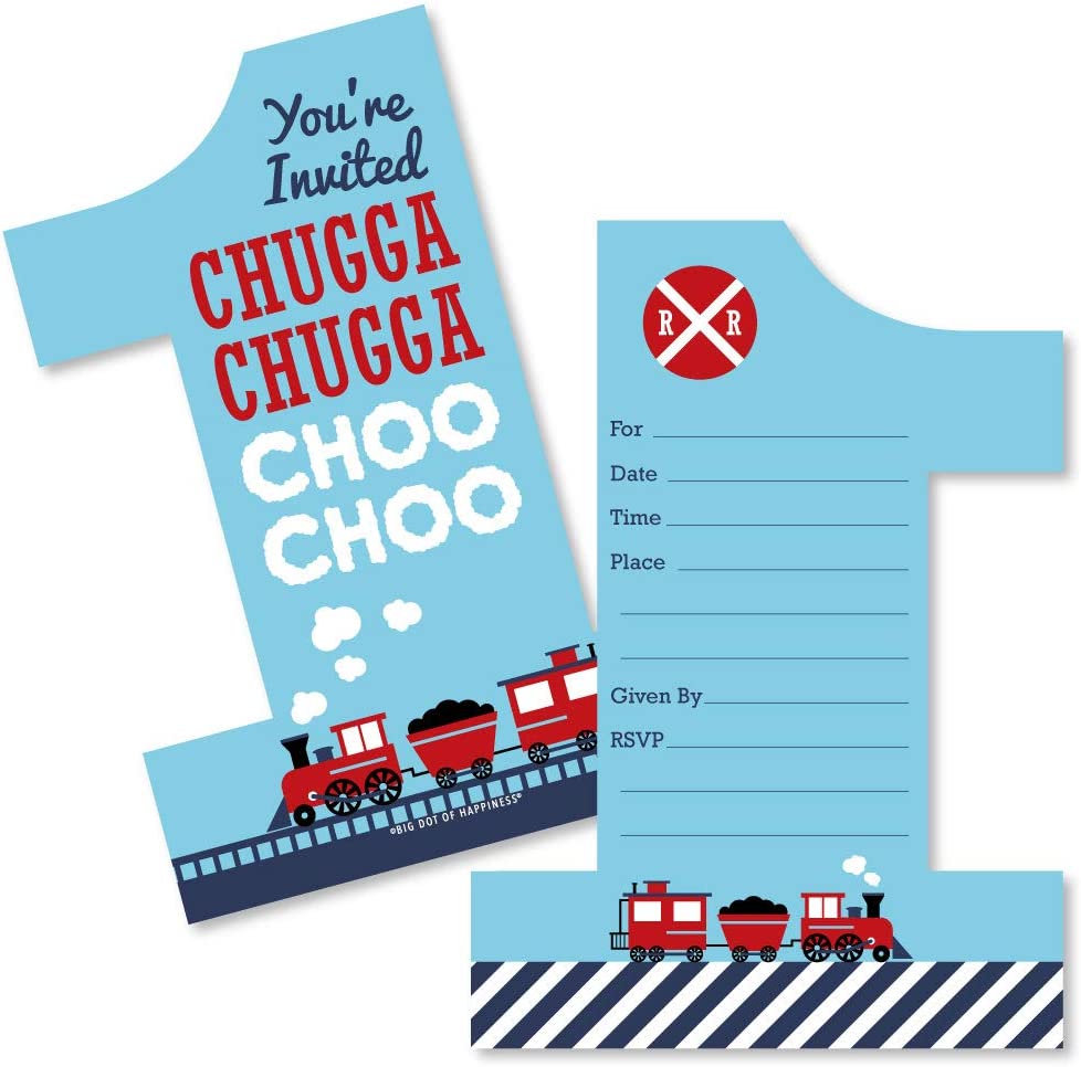 1st Birthday Railroad Party Crossing - Shaped Fill-In Invitations - Steam Train First Birthday Party Invitation Cards with Envelopes - Set of 12