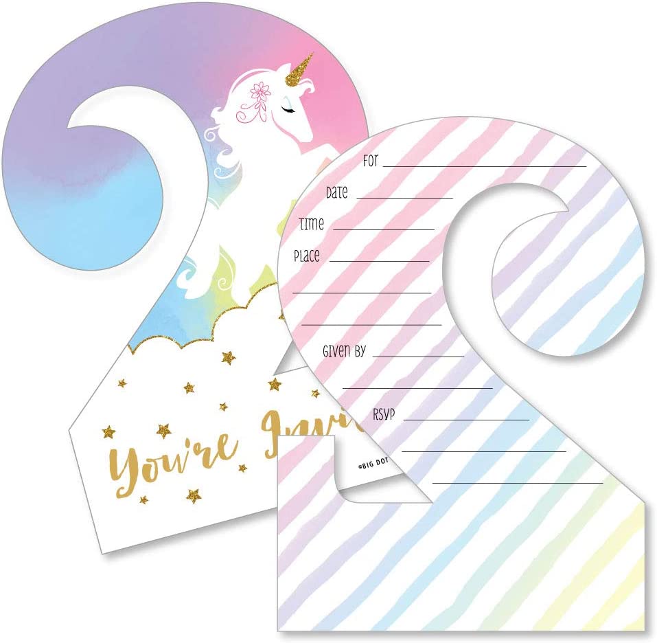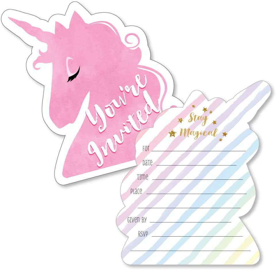 Shaped Fill-In Invitations - Magical Unicorn Baby Shower or Birthday Party Invitation Cards with Envelopes - Set of 12