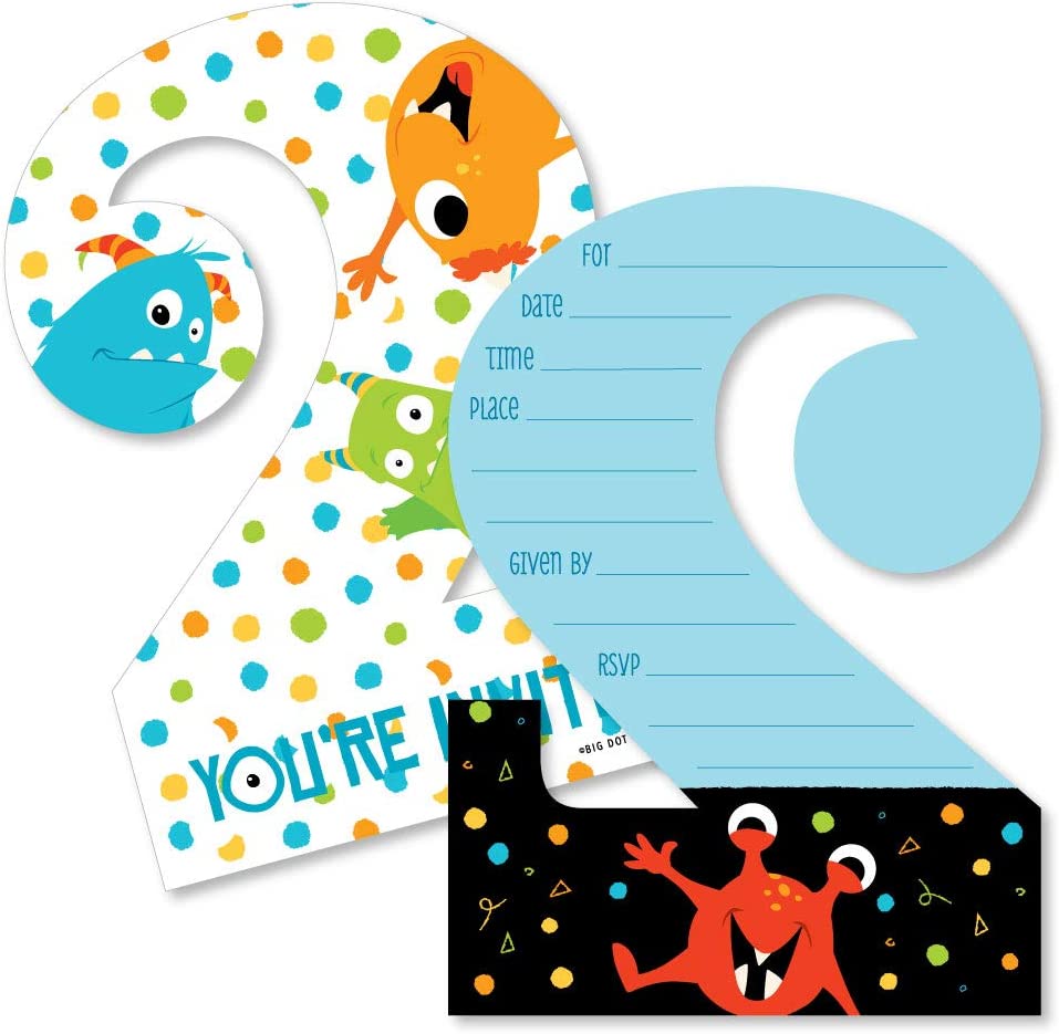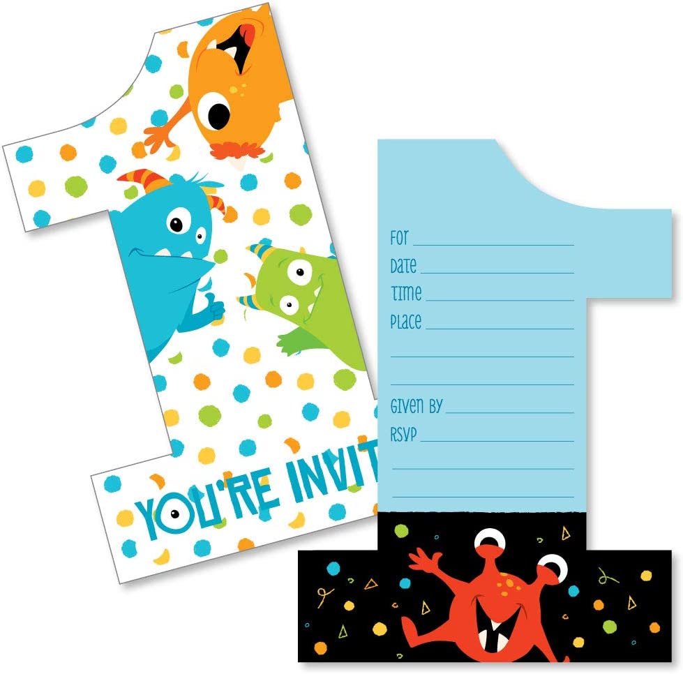 1st Birthday Monster Bash - Shaped Fill-In Invitations - Little Monster First Birthday Party Invitation Cards with Envelopes - Set of 12