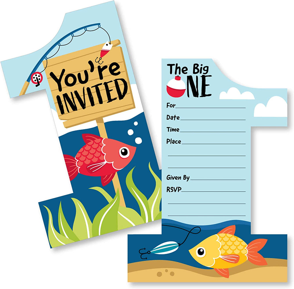 1st Birthday Reeling in the Big One - Shaped Fill-In Invitations - Fish First Birthday Party Invitation Cards with Envelopes - Set of 12