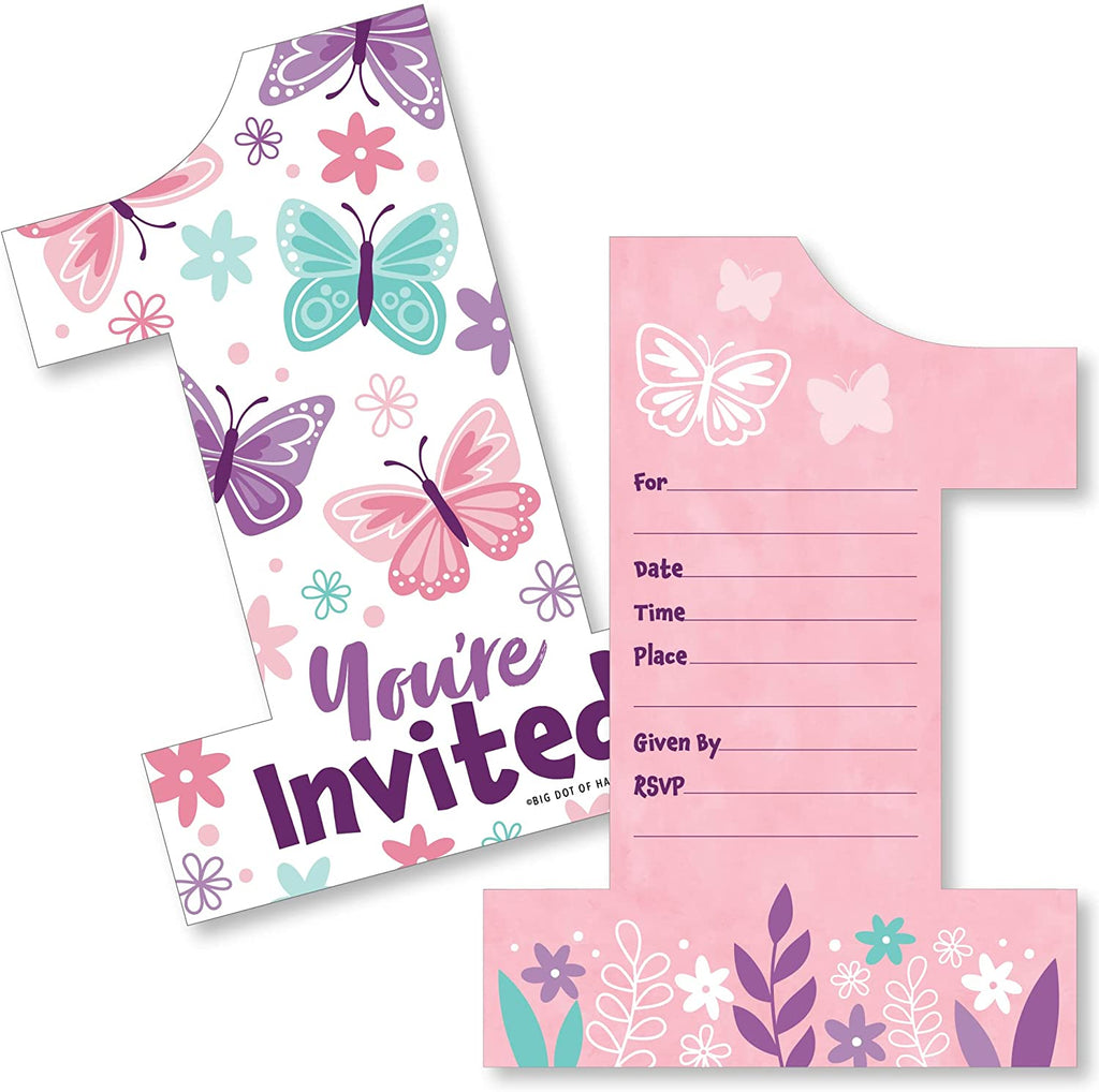 1st Birthday Beautiful Butterfly - Shaped Fill-In Invitations - Floral First Birthday Party Invitation Cards with Envelopes - Set of 12