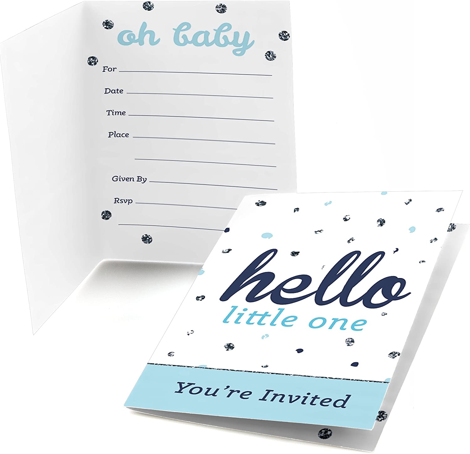 Hello Little One - Blue and Silver - Fill In Boy Baby Shower Party Invitations (8 count) is backordered and will ship as soon as it is back in stock.
