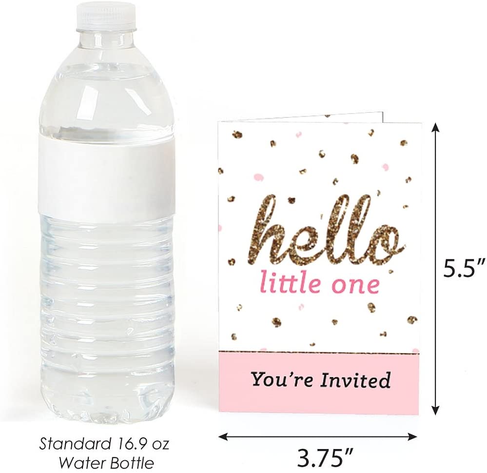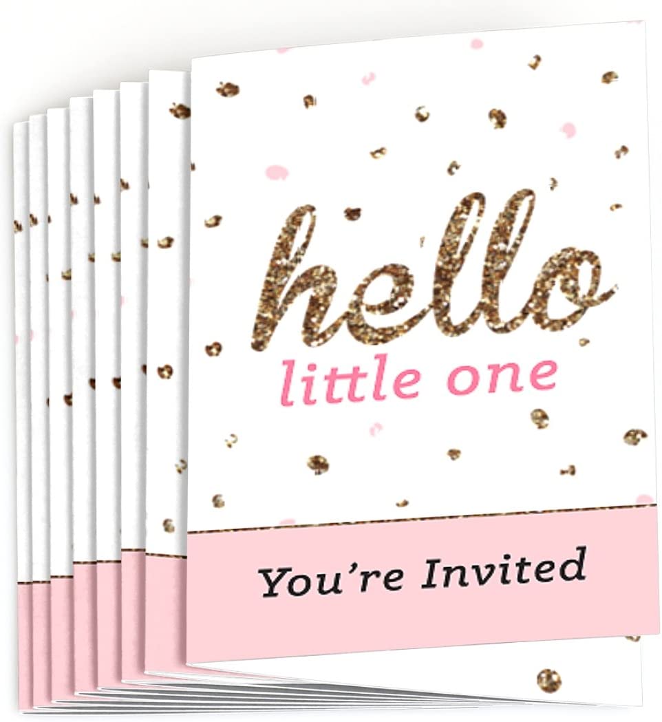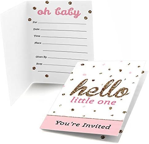• Hello Little One - Pink and Gold Fill-In the Blank Invitation Set INCLUDES 8 baby shower invitations and premium white envelopes. Hello Little One - Pink and Gold fill-in invitations are perfect for a girl baby shower.