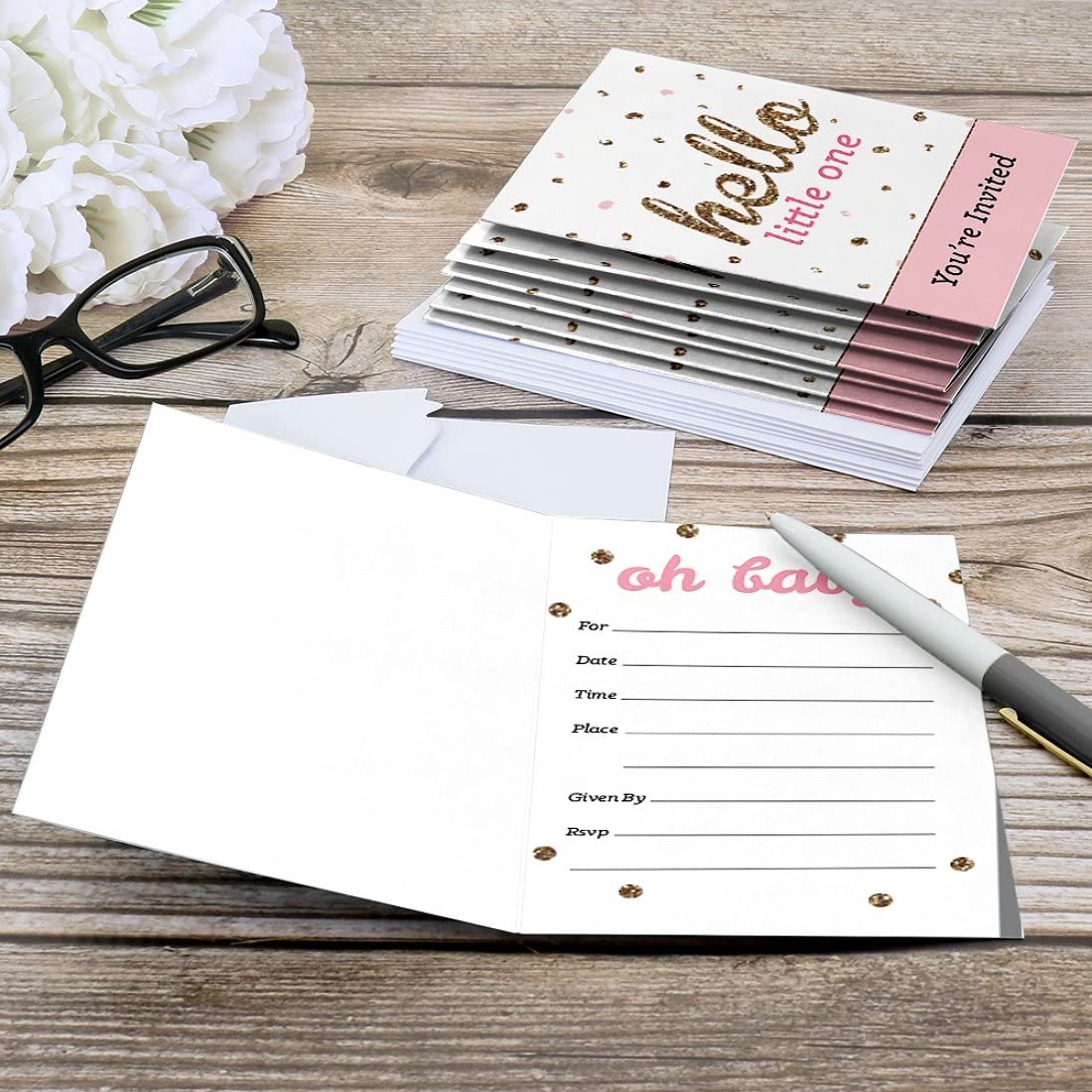 • PREMIUM PARTY INVITATIONS: Hello Little One - Pink and Gold baby shower invitations are professionally printed on heavy-duty cardstock paper with a photo-like shine. They are then hand-folded and individually inspected, then carefully packaged with our exclusive squiggle flap envelopes, making this Pink and Gold stationary set a must-have for any baby shower.
