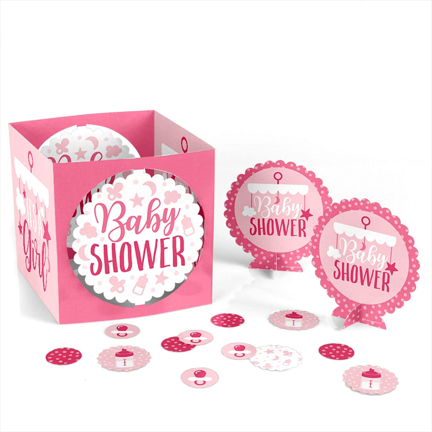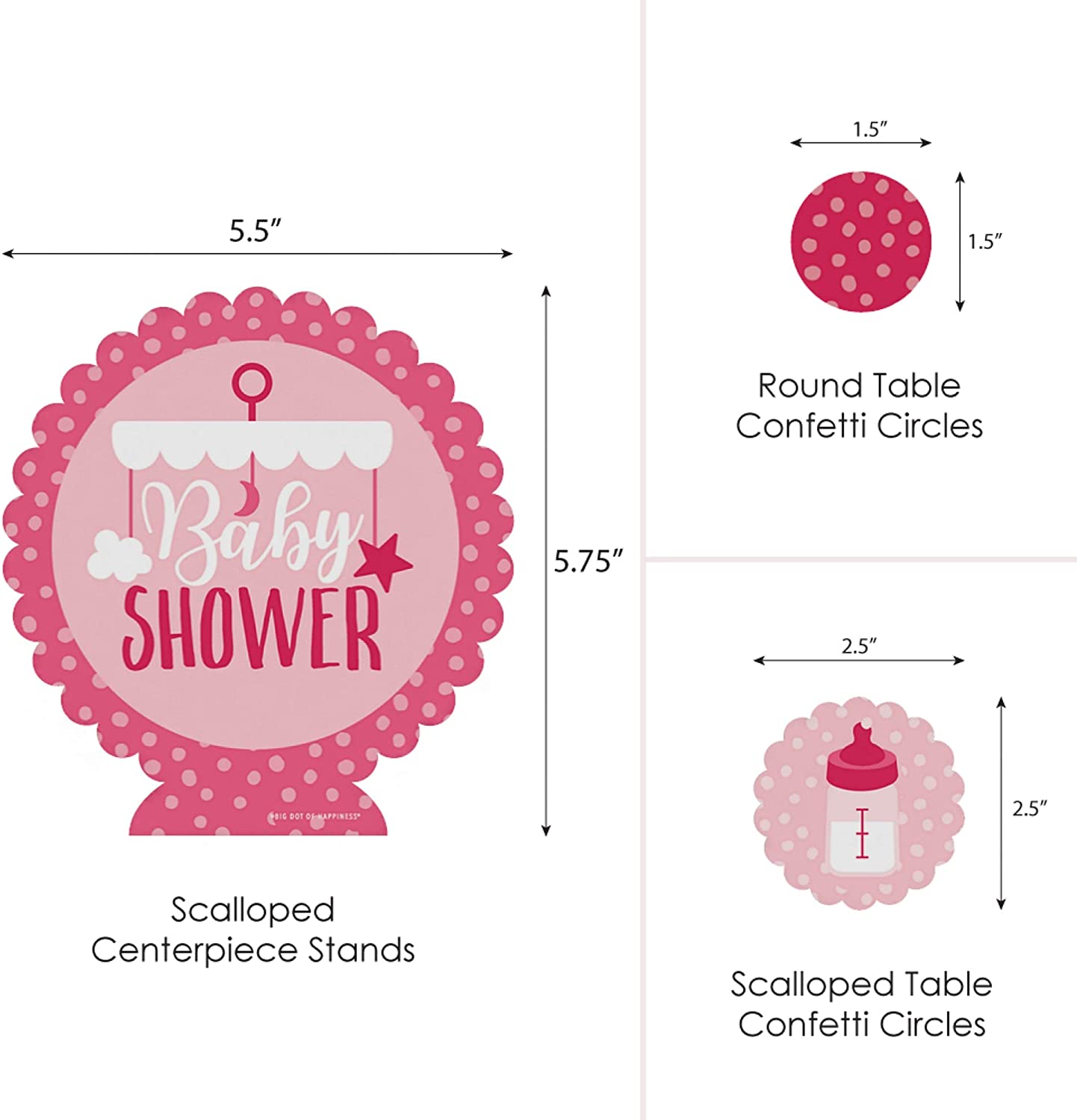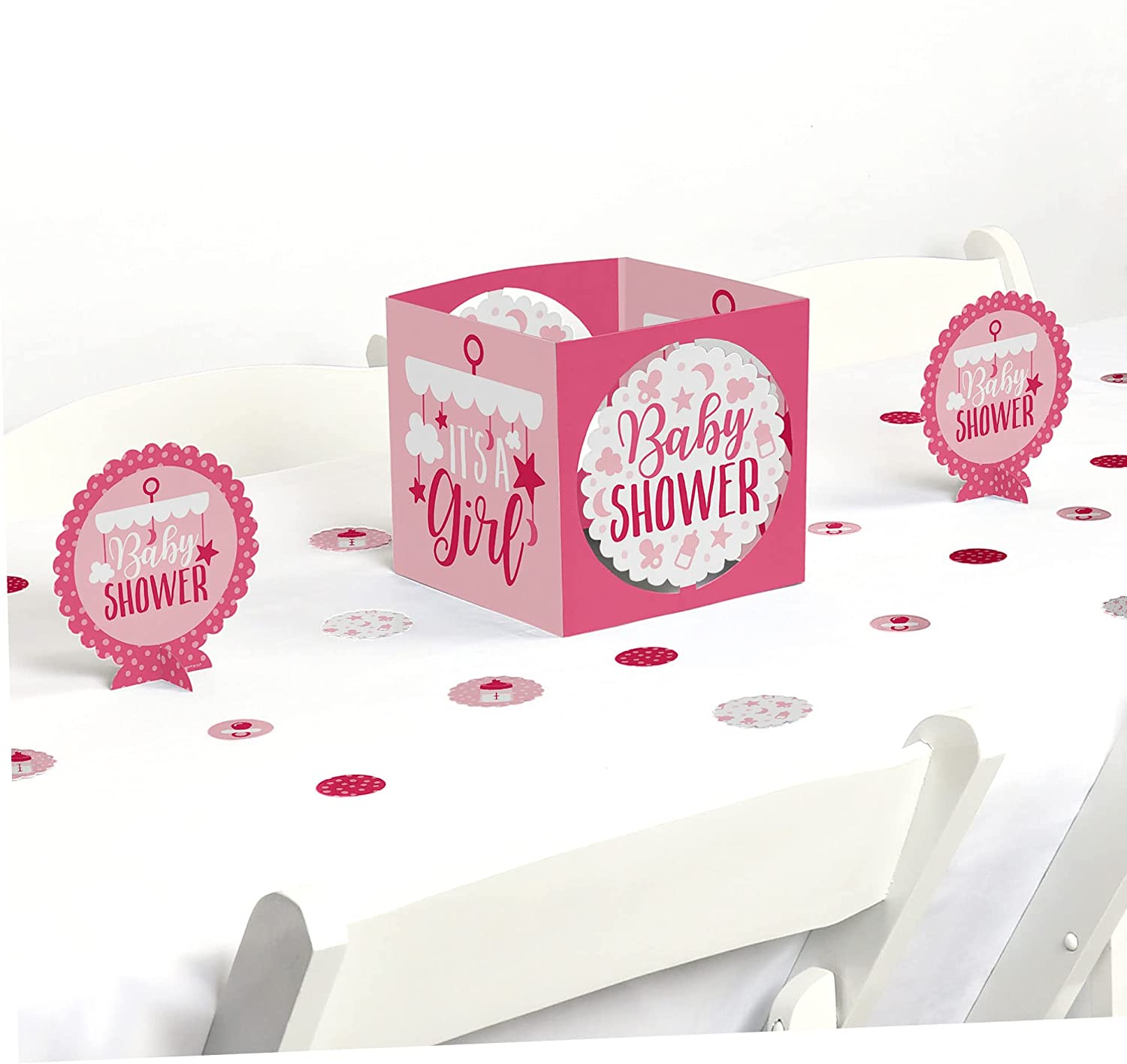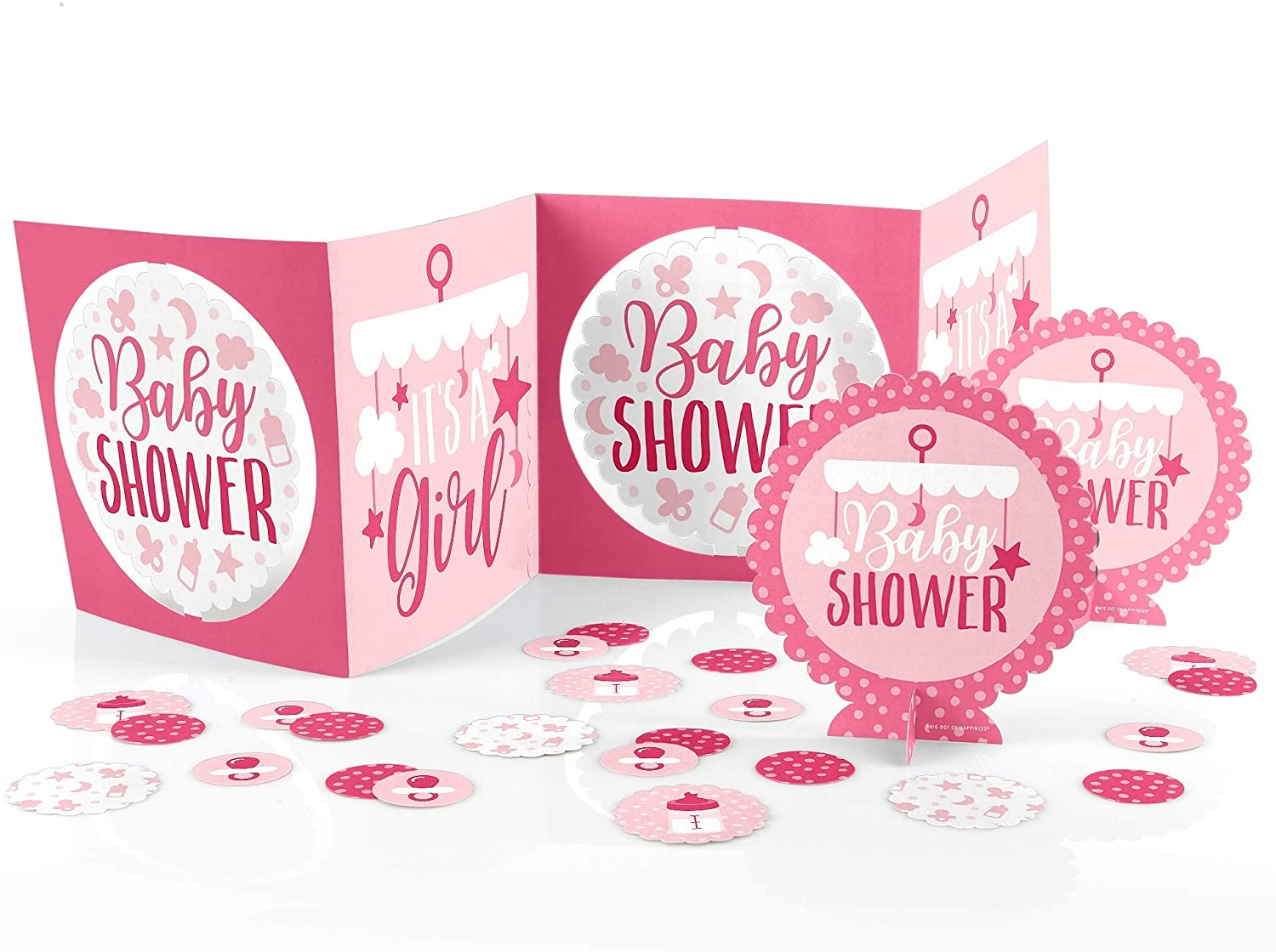• It’s a Girl Table Decoration Kit INCLUDES 1 large pink centerpiece, 2 scalloped centerpieces, 12 scalloped table confetti pieces and 24 round table confetti pieces. It’s a Girl party table decorations are perfect for a baby shower.