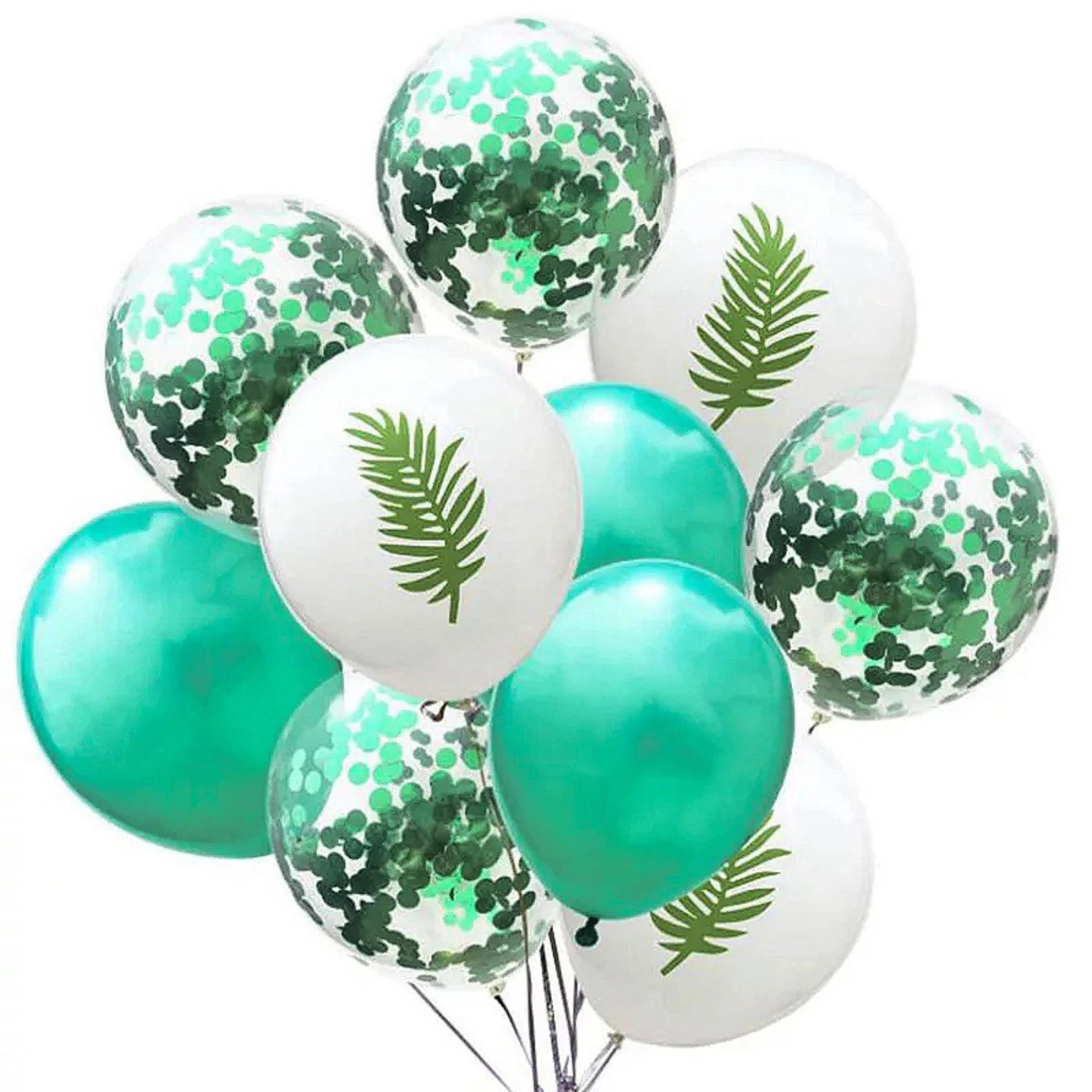 4 clear latex balloons with green confetti, 3 white latex balloons with banana leaves, 3 green latex balloons