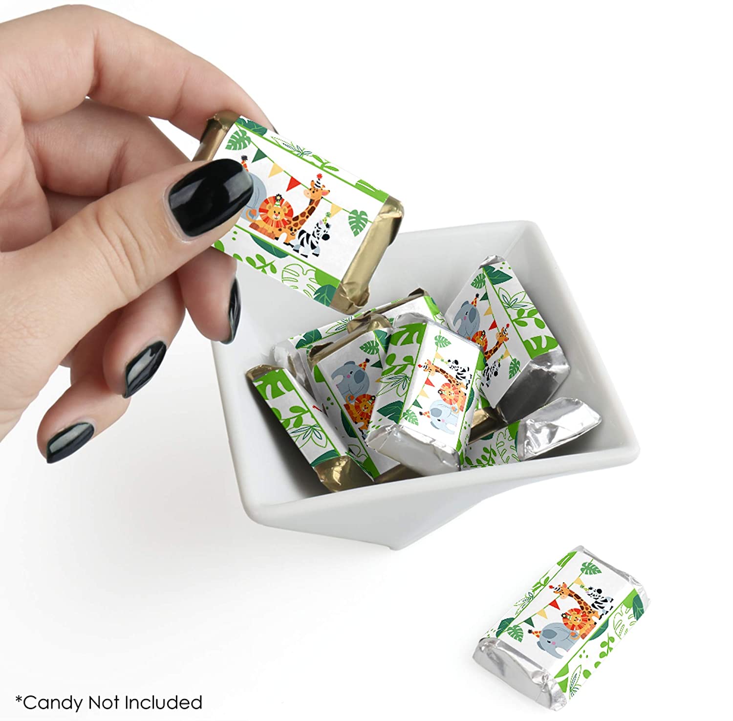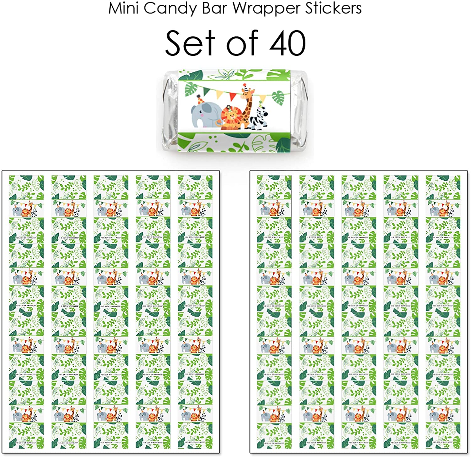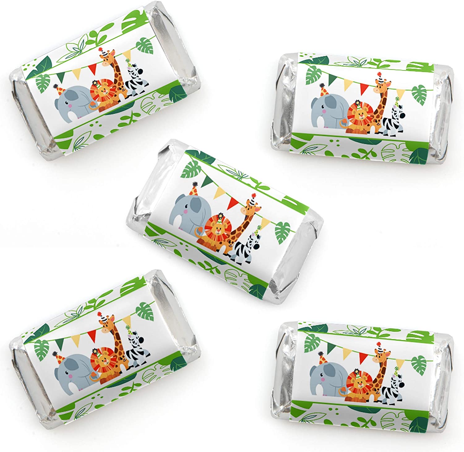 • Jungle Party Animals Mini Candy Bar Wrappers INCLUDES 40 candy stickers, perfect for styling an adorable Safari candy buffet or unique baby shower or birthday party favors.