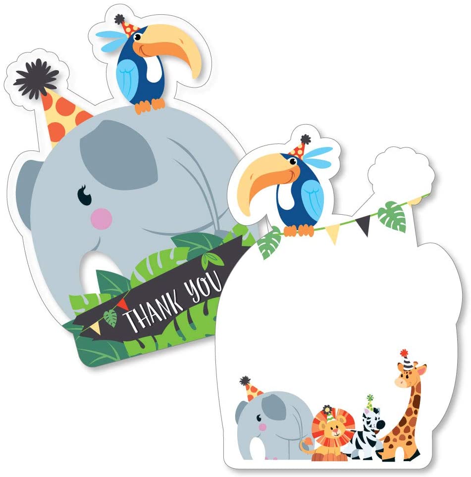 Jungle Party Animals - Shaped Thank You Cards - Safari Zoo Animal Birthday Party or Baby Shower Thank You Note Cards with Envelopes - Set of 12