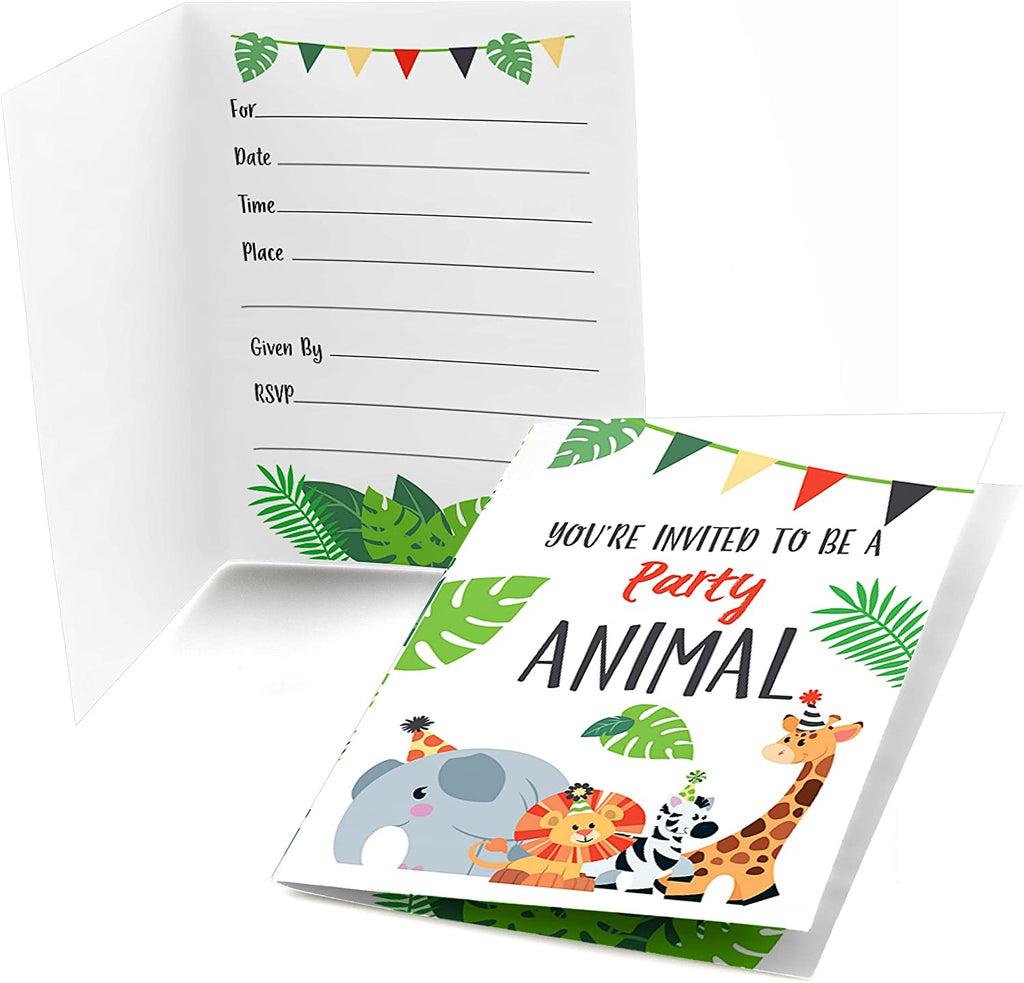 Jungle Party Animals - Shaped Fill-In Invitations - Safari Zoo Animal Birthday Party or Baby Shower Invitation Cards with Envelopes - Set of 12