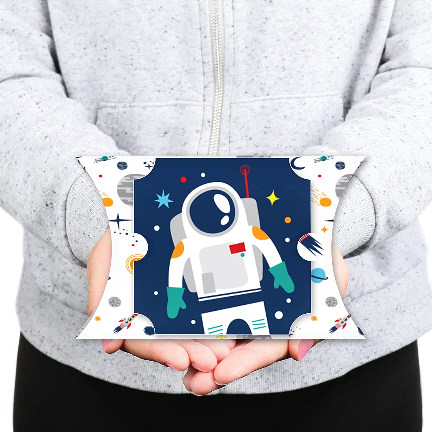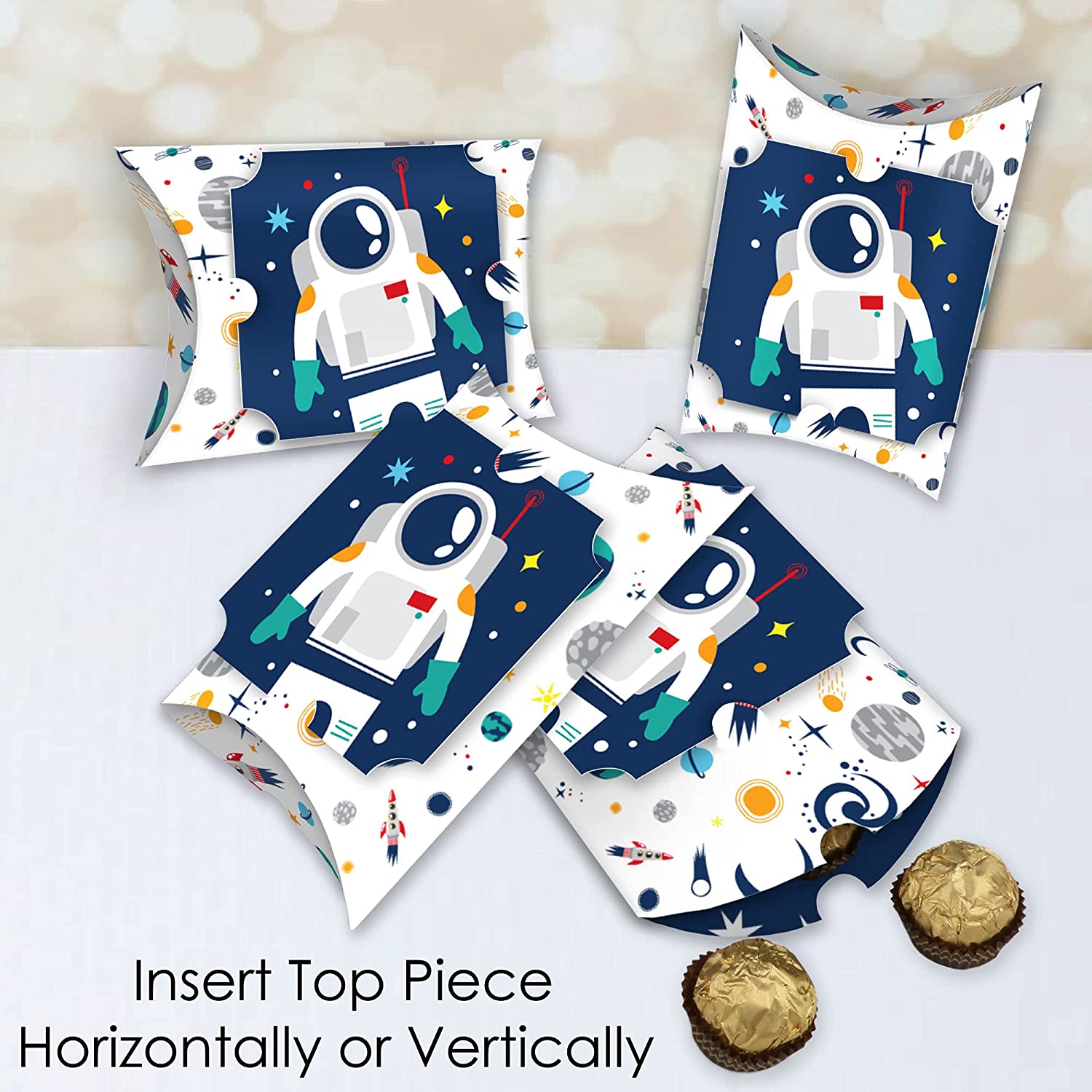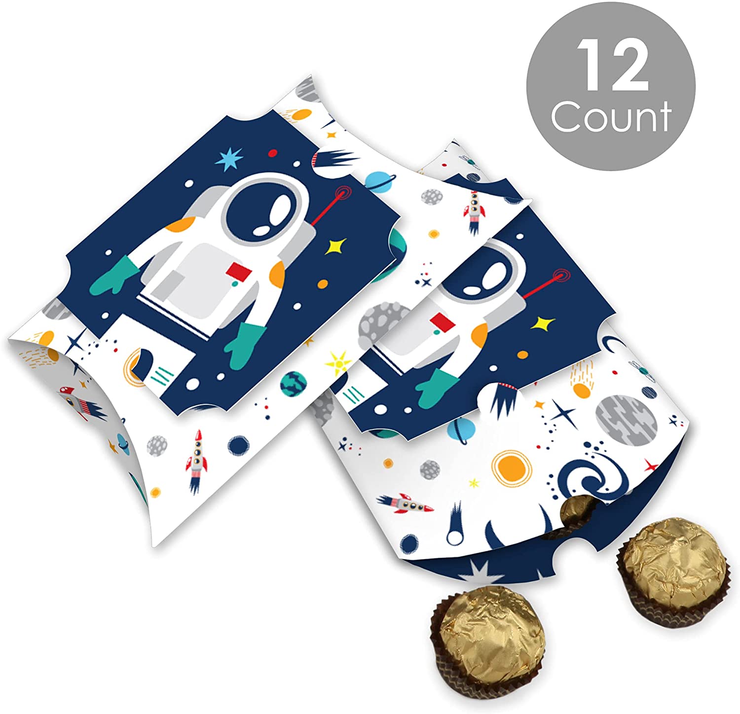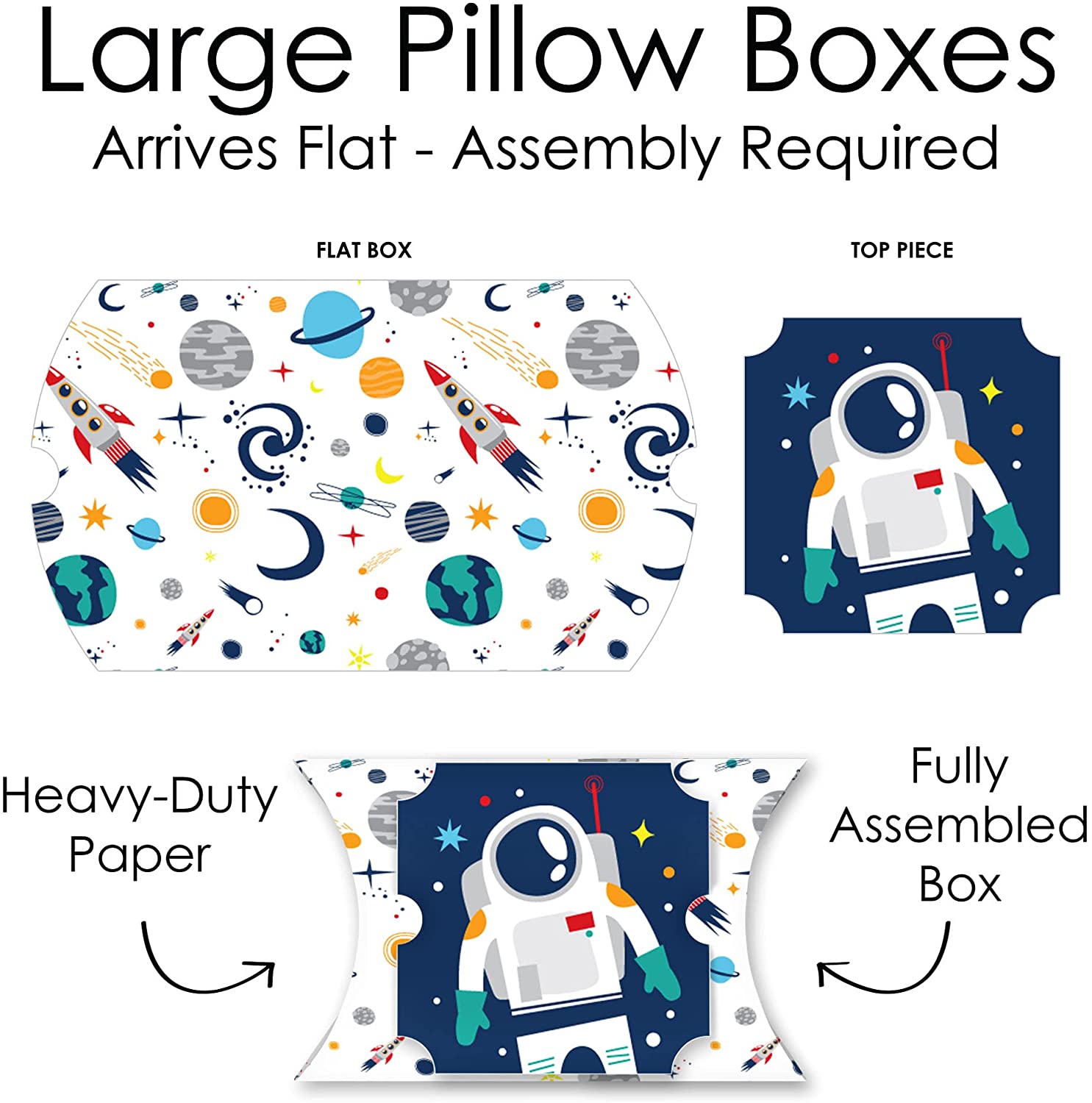 • Blast Off to Outer Space Large Pillow Boxes INCLUDES 12 boxes and 12 decorative top pieces. Boxes arrive flat and require some easy assembly. These Blast Off to Outer Space favor gift boxes make great giveaways at your next Baby Shower or Birthday Party.