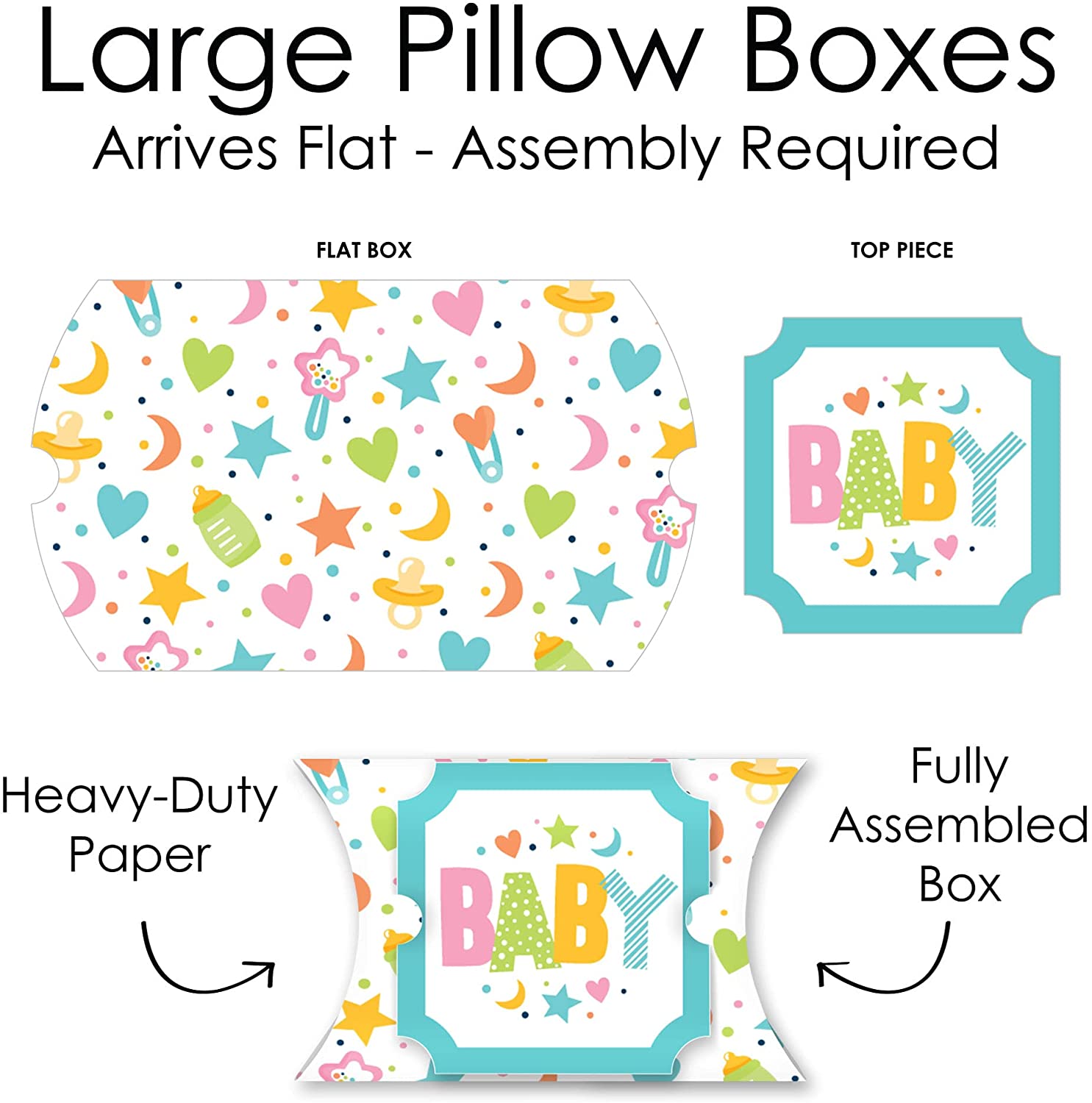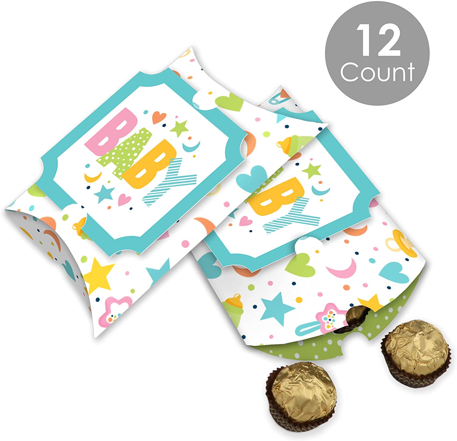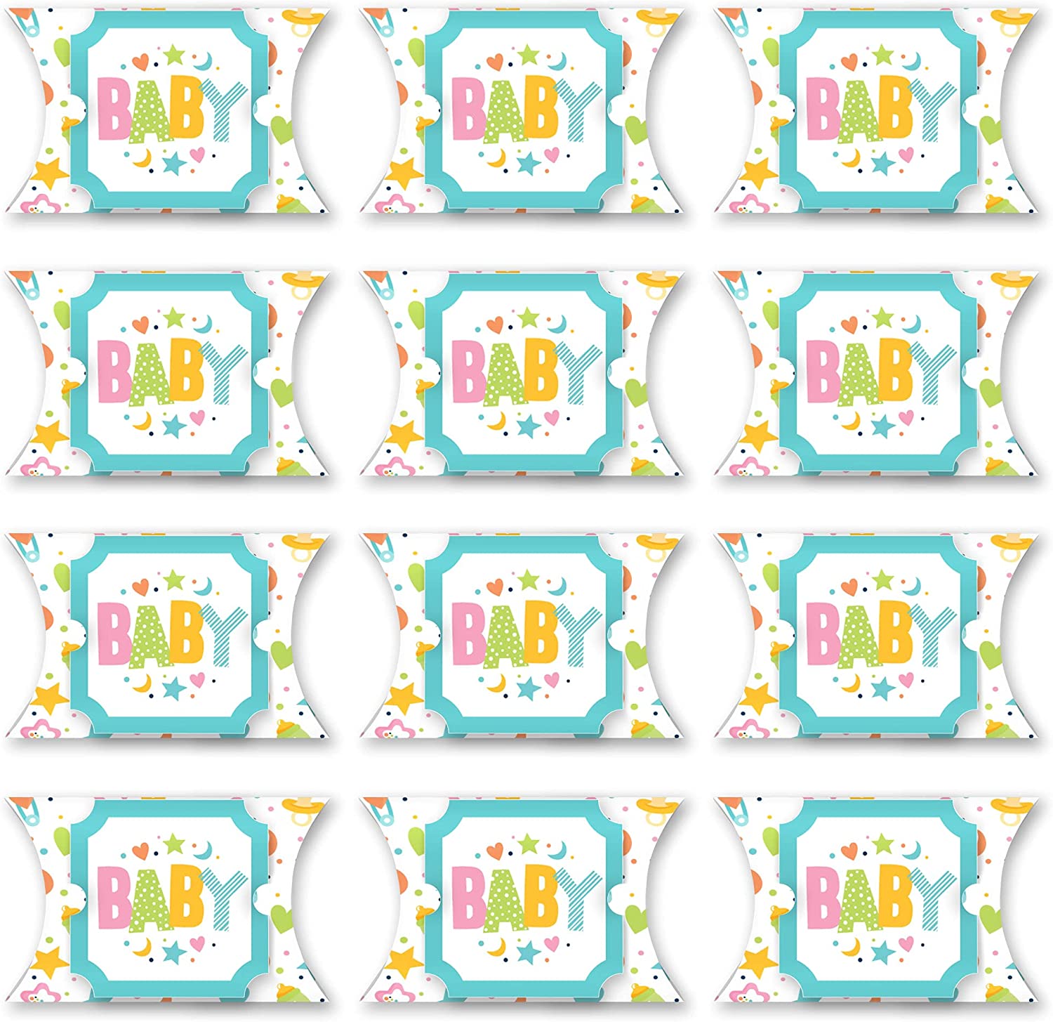 Colorful Baby Shower - Favor Gift Boxes - Gender Neutral Party Large Pillow Boxes - Set of 12 is backordered and will ship as soon as it is back in stock.