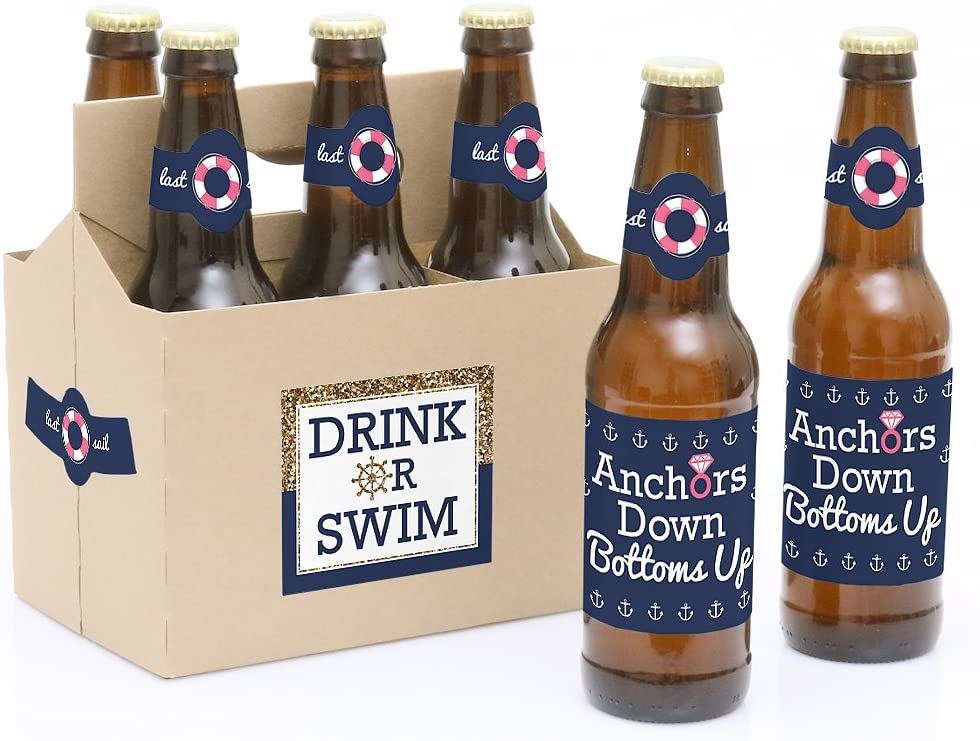 Last Sail Before the Veil - Nautical Bridal Shower and Bachelorette Party Decorations for Women - 6 Beer Bottle Label Stickers and 1 Carrier