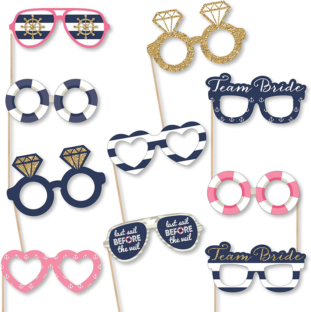 Last Sail Before The Veil Glasses - Paper Card Stock Nautical Bachelorette and Bridal Shower Photo Booth Props Kit - 10 Count