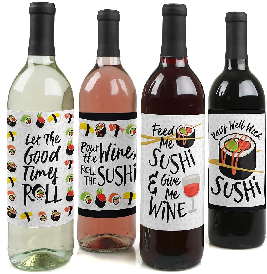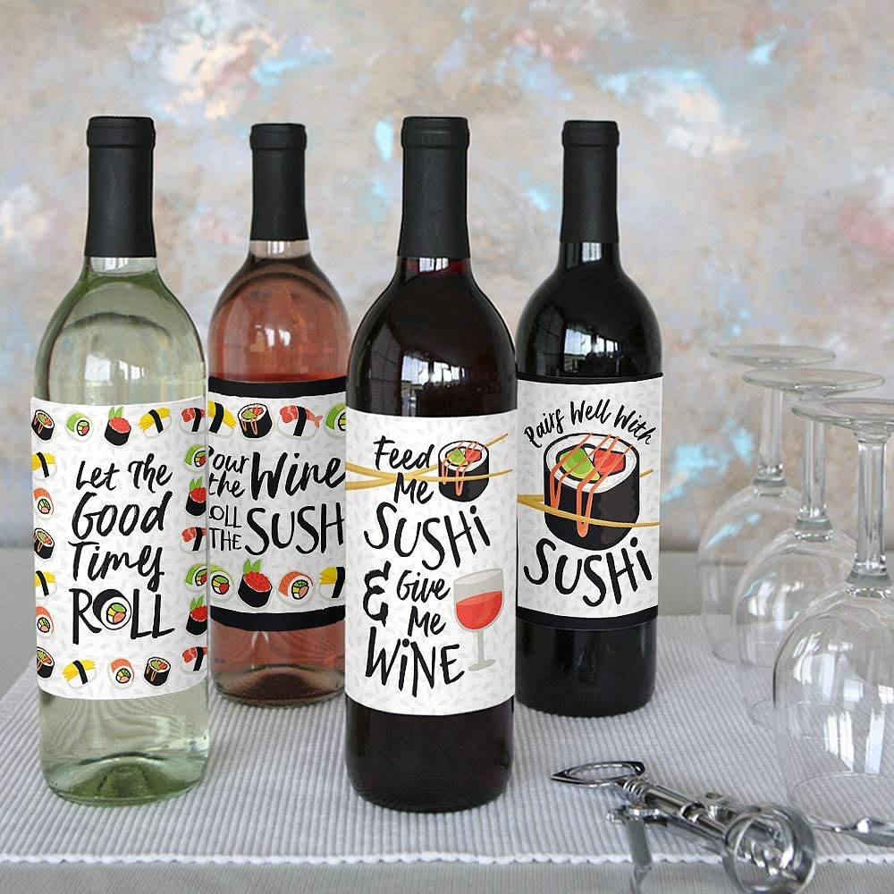 • UNIQUE GIFT IDEA: Sushi Wine Bottle Labels also make a great gift idea. Add Let’s Roll - Sushi Wine Bottle labels to a favorite bottle of wine or spirits for a special gift. Use each wine label on a favorite beverage bottle and gift individually or create an impressive gift basket using all 4 labels on coordinating wine or liquor bottles. Wine bottle labels will easily give your gift a personal touch!