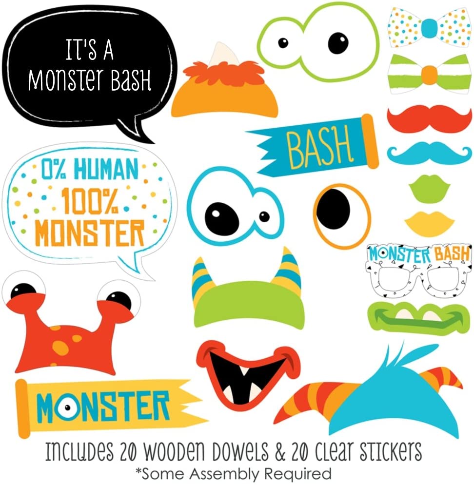 • 20-Piece Baby Shower or Birthday Party Photo Booth Props Kit INCLUDES 20 Monster Bash photo booth props, 20 wooden dowel sticks and adhesives for assembly. EASY ASSEMBLY: Simply attach the printed DIY photo booth props to the wooden dowels with included adhesive and reinforcing stickers.