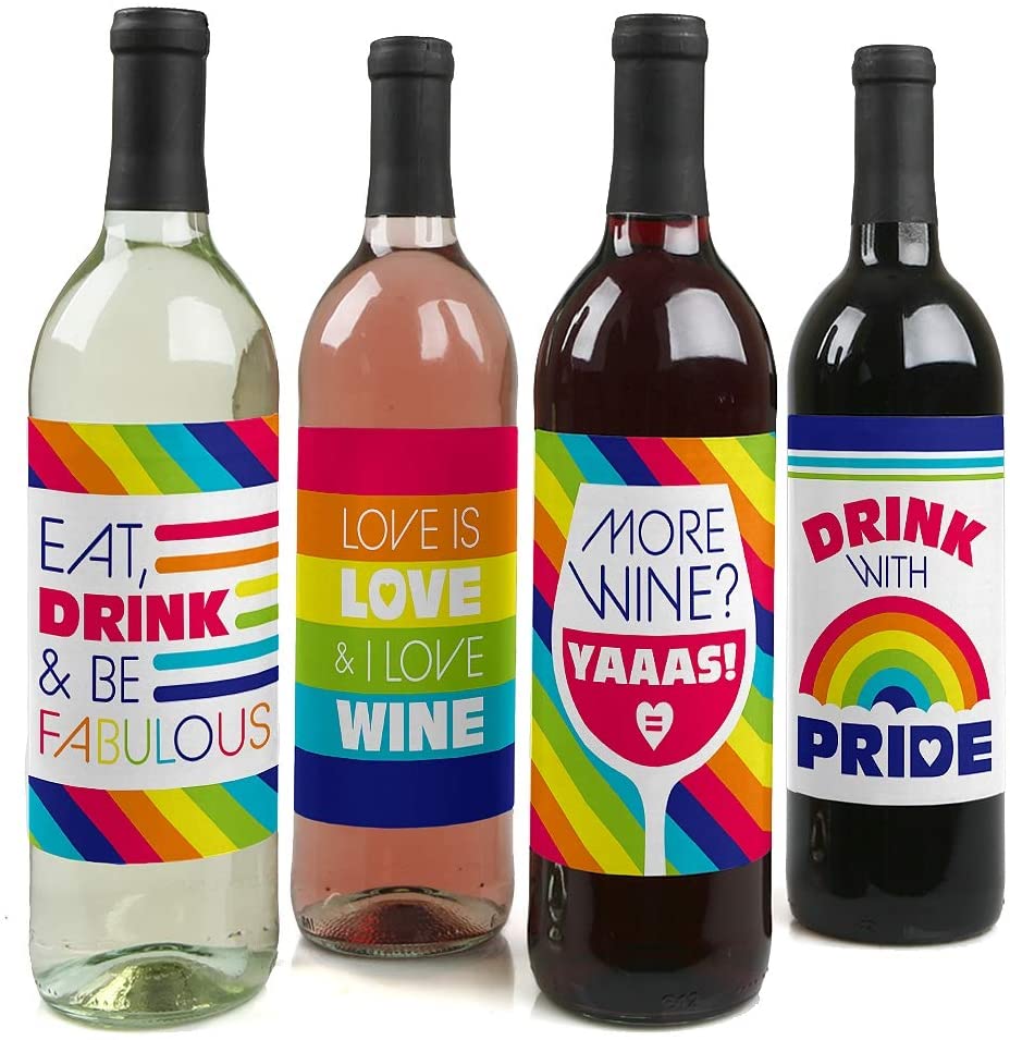 Love is Love - Gay Pride - LGBTQ Rainbow Party Decorations for Women and Men - Wine Bottle Label Stickers - Set of 4