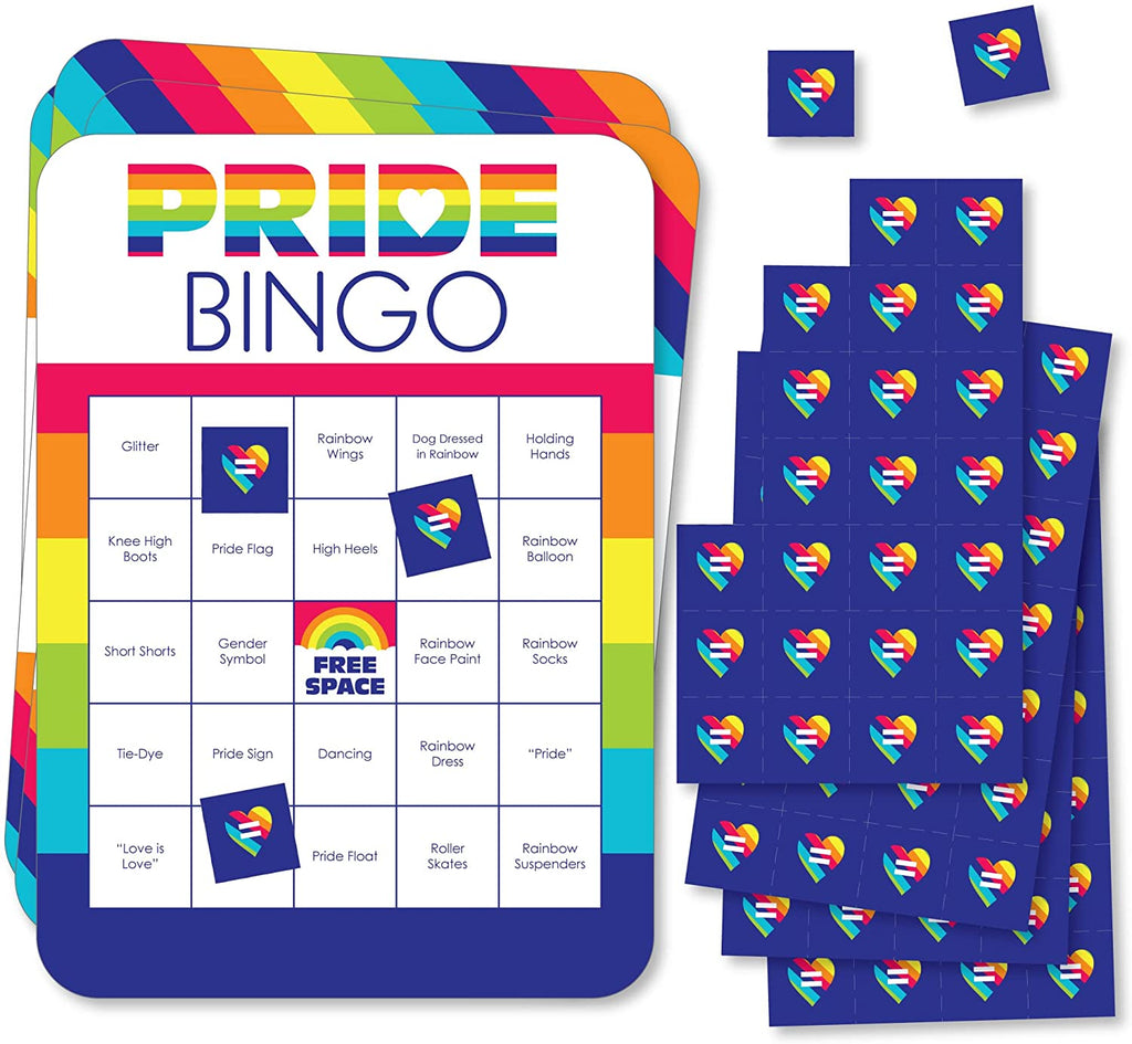 Love is Love - Gay Pride - Bar Bingo Cards and Markers - LGBTQ Rainbow Party Shaped Bingo Game - Set of 18
