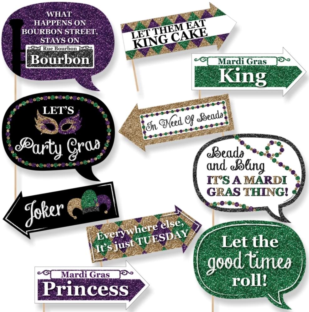 • 10-Piece Funny Mardi Gras Photo Booth Props Kit INCLUDES 10 Purple, Green and Black arrow and speech bubble photo booth props, 10 wooden dowel sticks and adhesives for assembly. EASY ASSEMBLY: Simply attach the printed DIY photo booth props to the wooden dowels with included adhesive and reinforcing stickers.