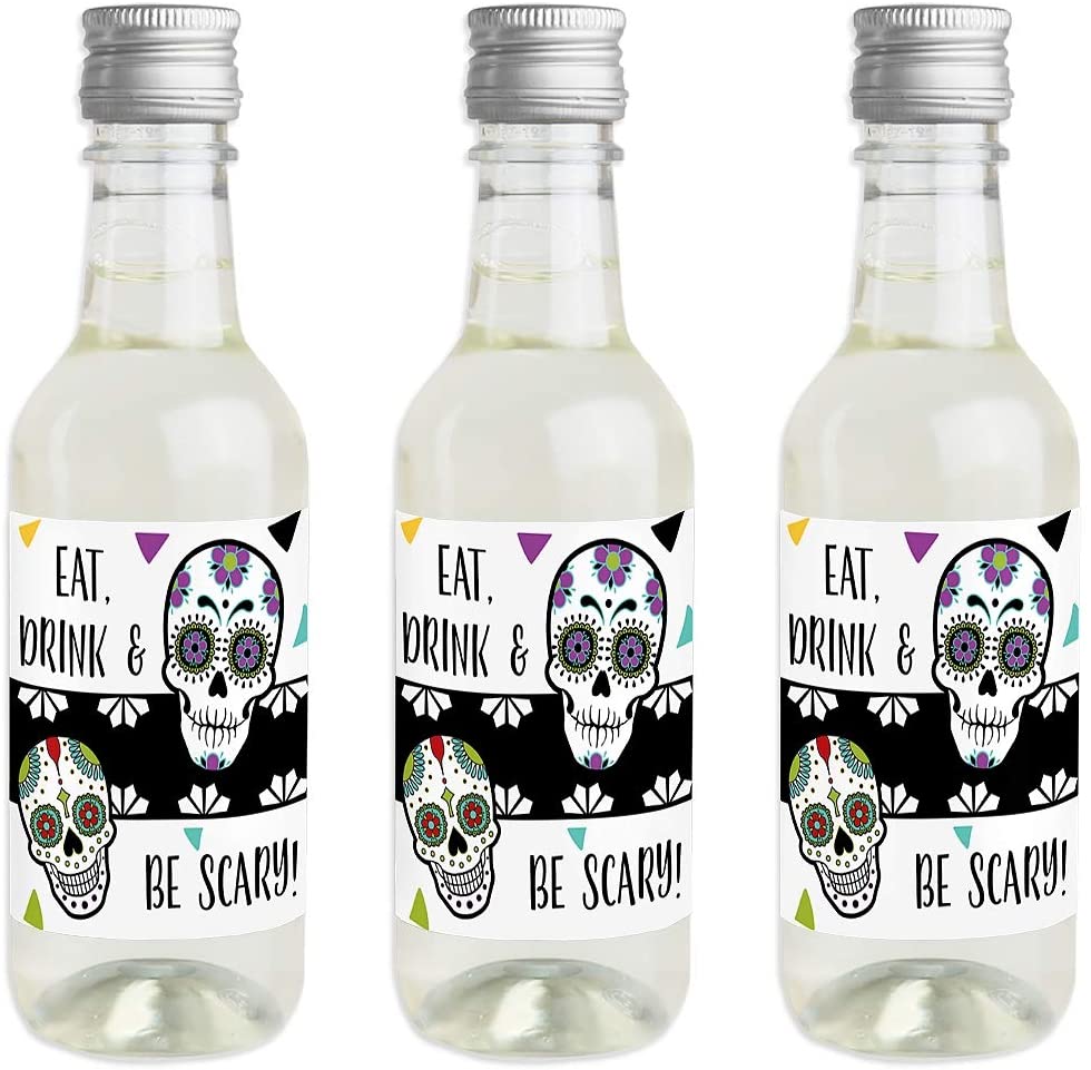 Day of the Dead - Mini Wine and Champagne Bottle Label Stickers - Halloween Sugar Skull Party Favor Gift for Women and Men - Set of 16
