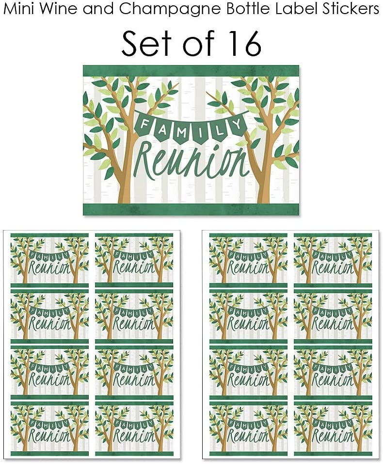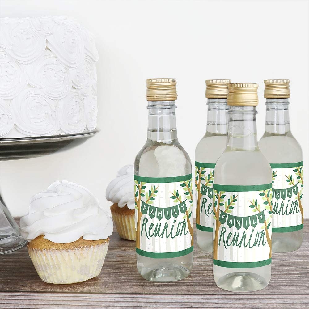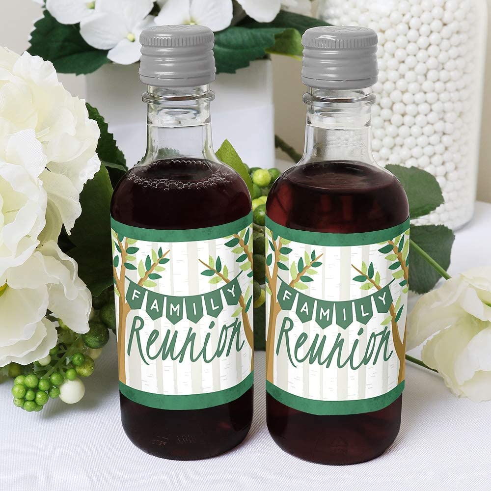 • Family Tree Reunion Mini Wine and Champagne Bottle Labels INCLUDES Set of 16 family reunion single-serve bottle sticker labels in the Family Tree Reunion theme, perfect for a family gathering party gift.